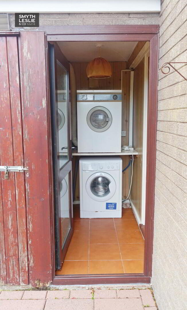 Plumbed for washing machine, tiled floor, PVC exterior door with glazed inset.