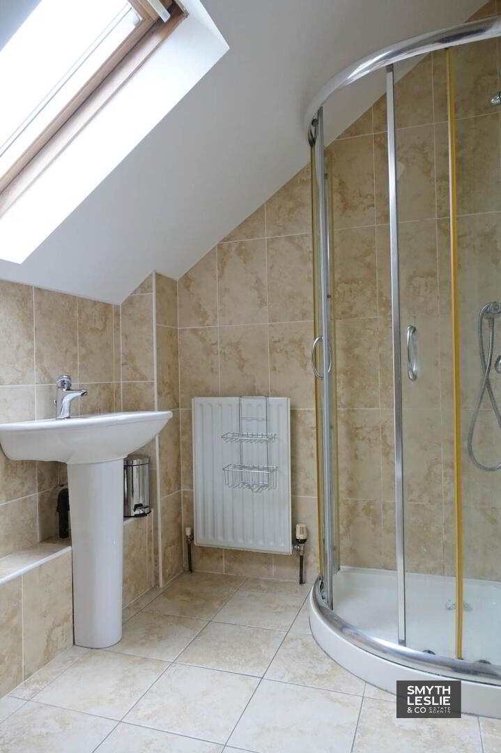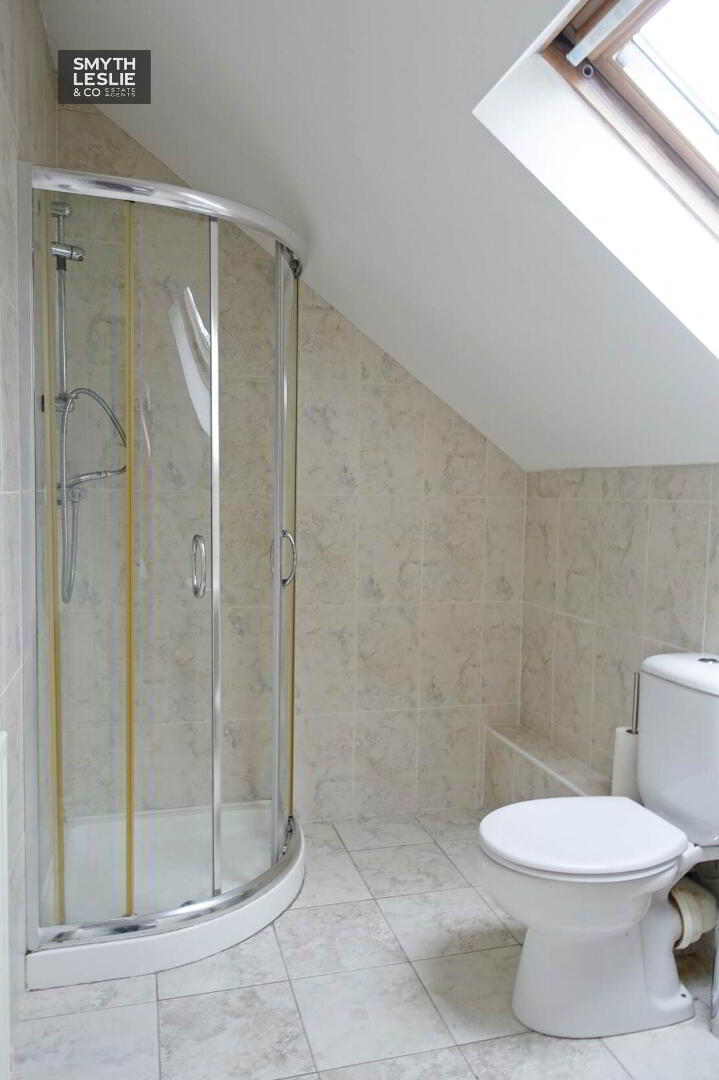 White suite, step in shower cubicle with thermostatically controlled shower, fully tiled.