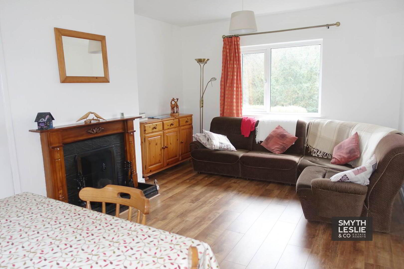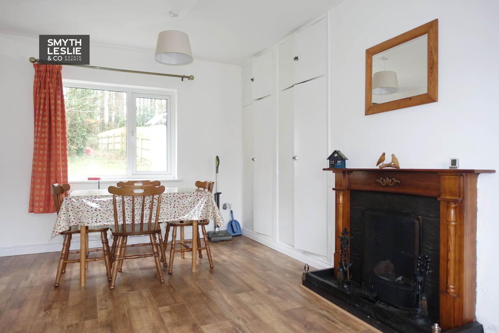 Solid wooden fireplace surround, tiled inset & hearth, Hotpress, built storage cupboard, laminate flooring, glazed oak doors