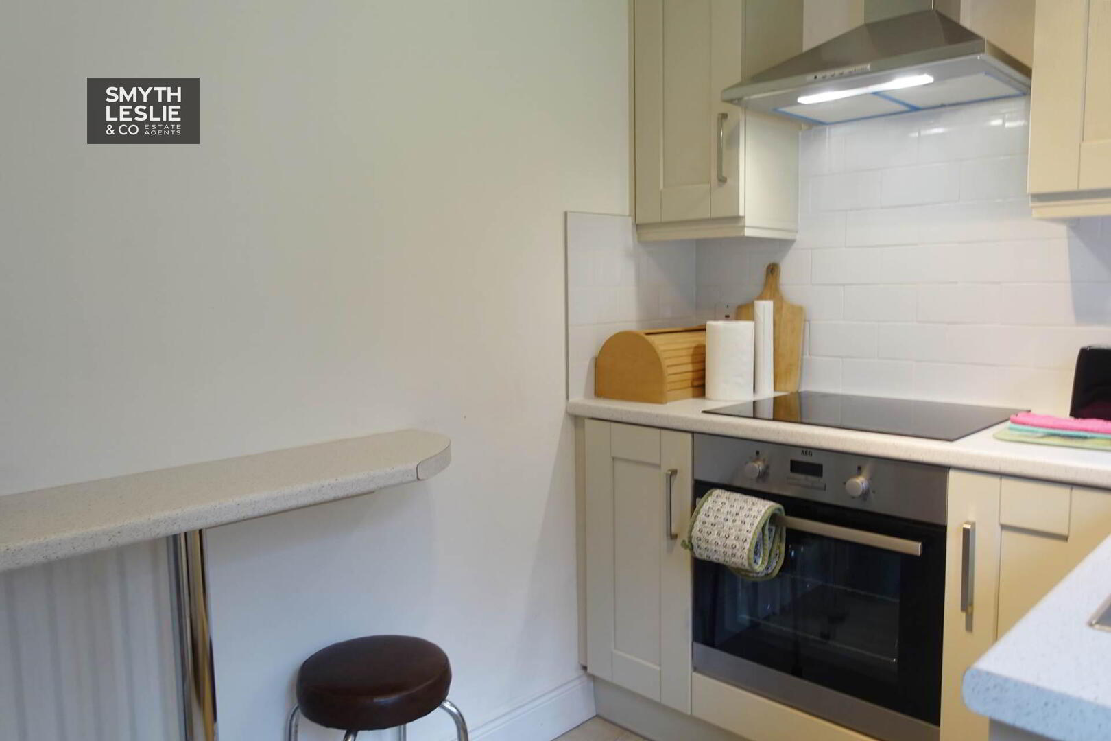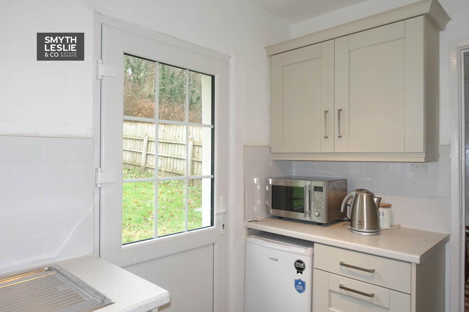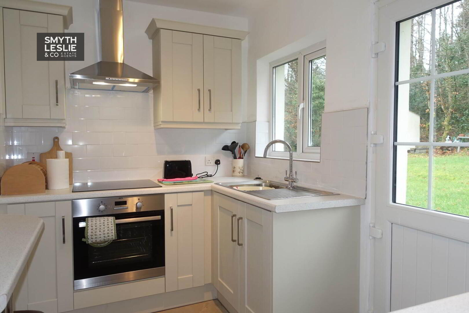 Modern fitted kitchen with a range of fitted units, integrated hob, oven & grill,PVC exterior door with glazed inset, s.s.sink unit, s.s.extractor fan shelf, breakfast bar shelf, tiled floor & splash back