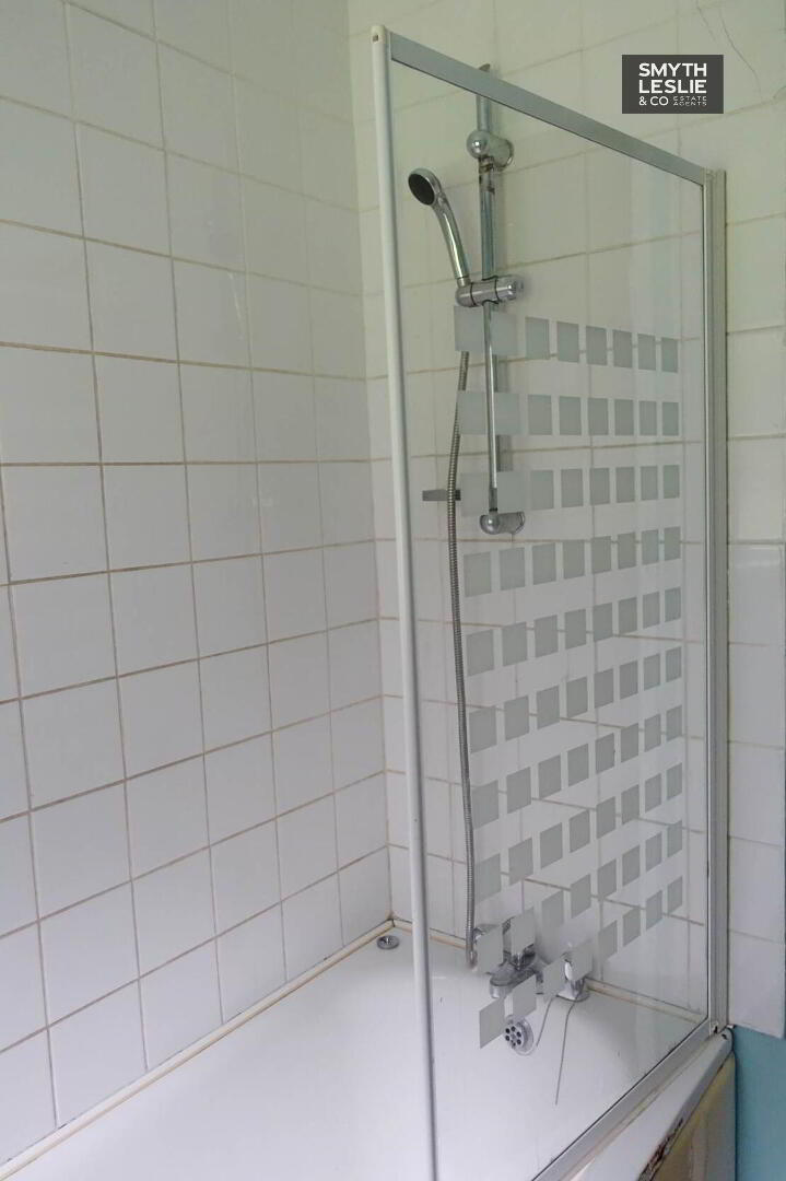 White suite, cast iron bath, shower head over bath & shower screen, tiled,floor & splash back, heated towel rail