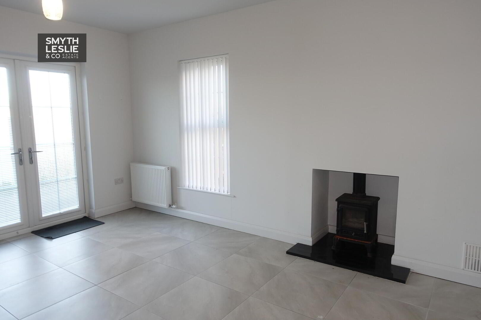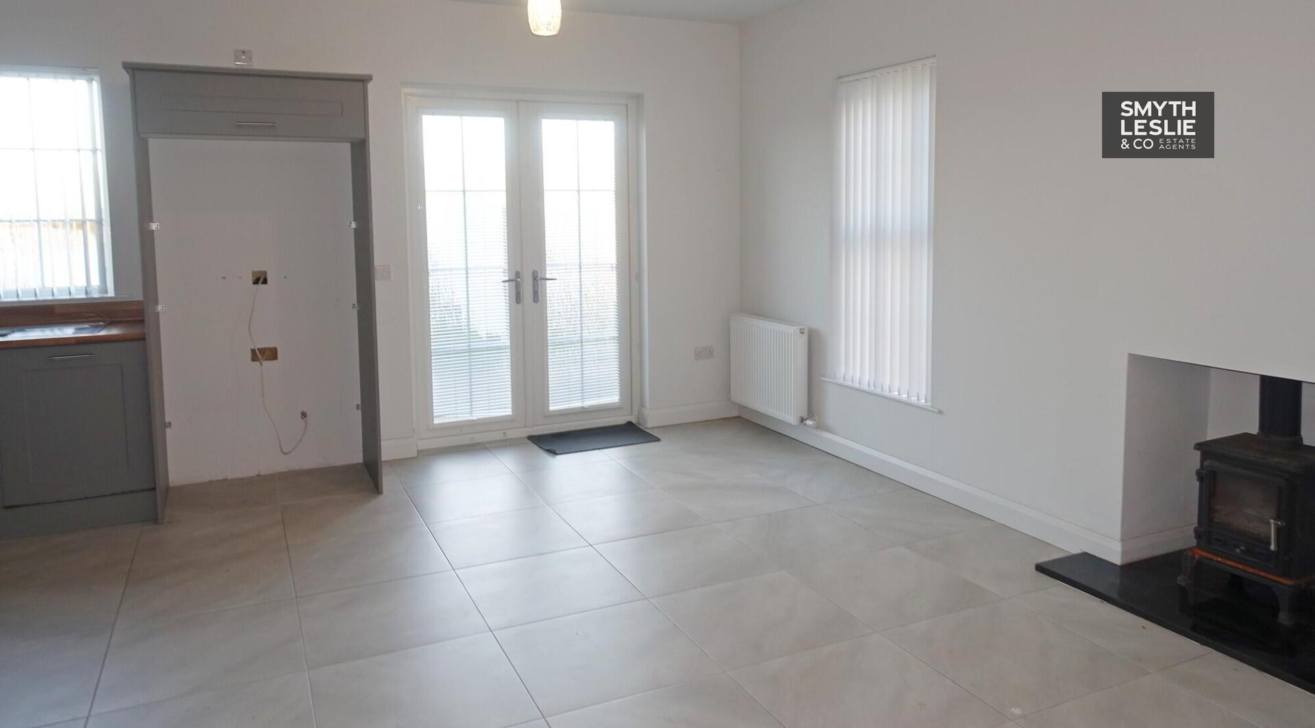Multi-fuel stove, tiled floor, PVC double patio doors leading to rear garden.