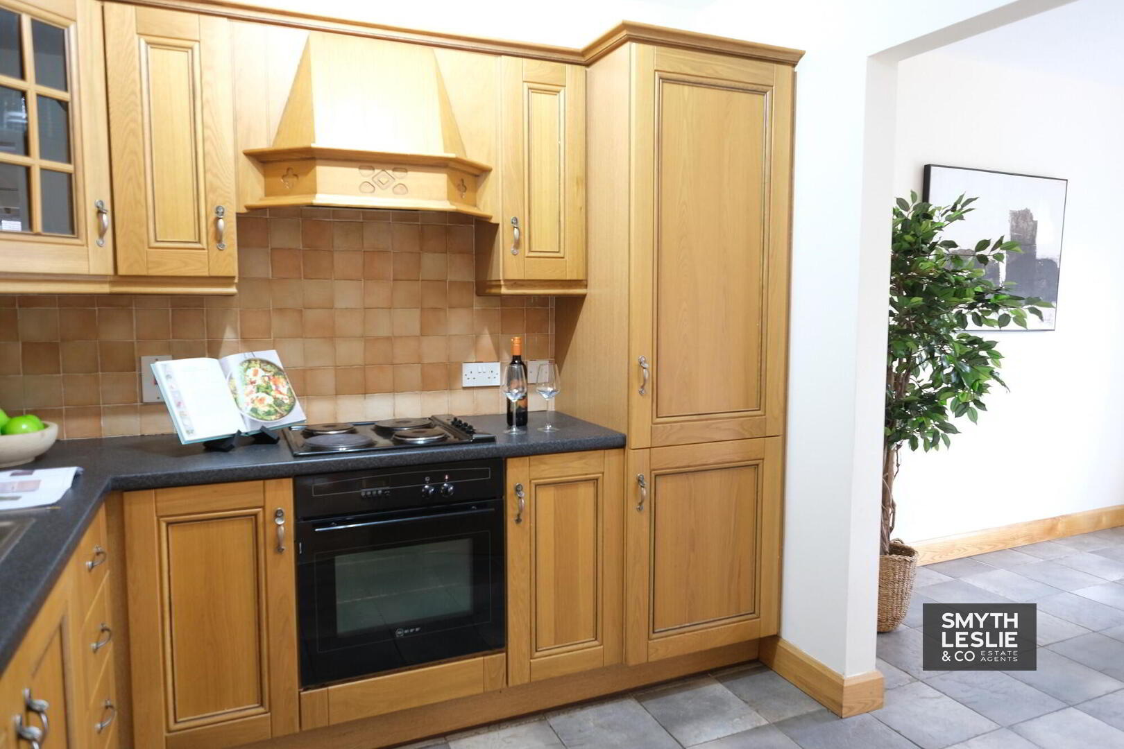 With stainless steel sink unit, range of high and low level cupboards, electric hob and oven, extractor fan, fridge freezer, plumbed for washing machine, spot lighting, tiled floor.
