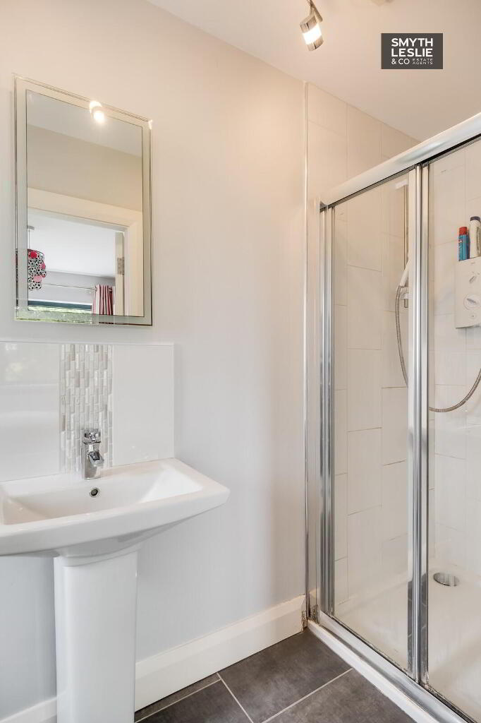White suite, step in shower cubicle with electric shower, tiled floor & splashback, heated towel rail.