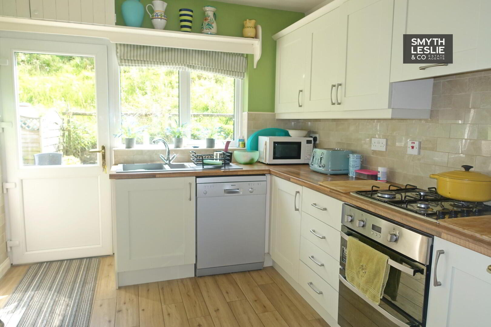 Modern fitted kitchen with a range of high & low level units, integrated gas hob, electric double oven & grill, extractor fan hood, fridge freezer, plumbed for dishwasher, composite sink unit, wood grain tiled floor, tiled splash back, PVC exterior door with glazed inset.