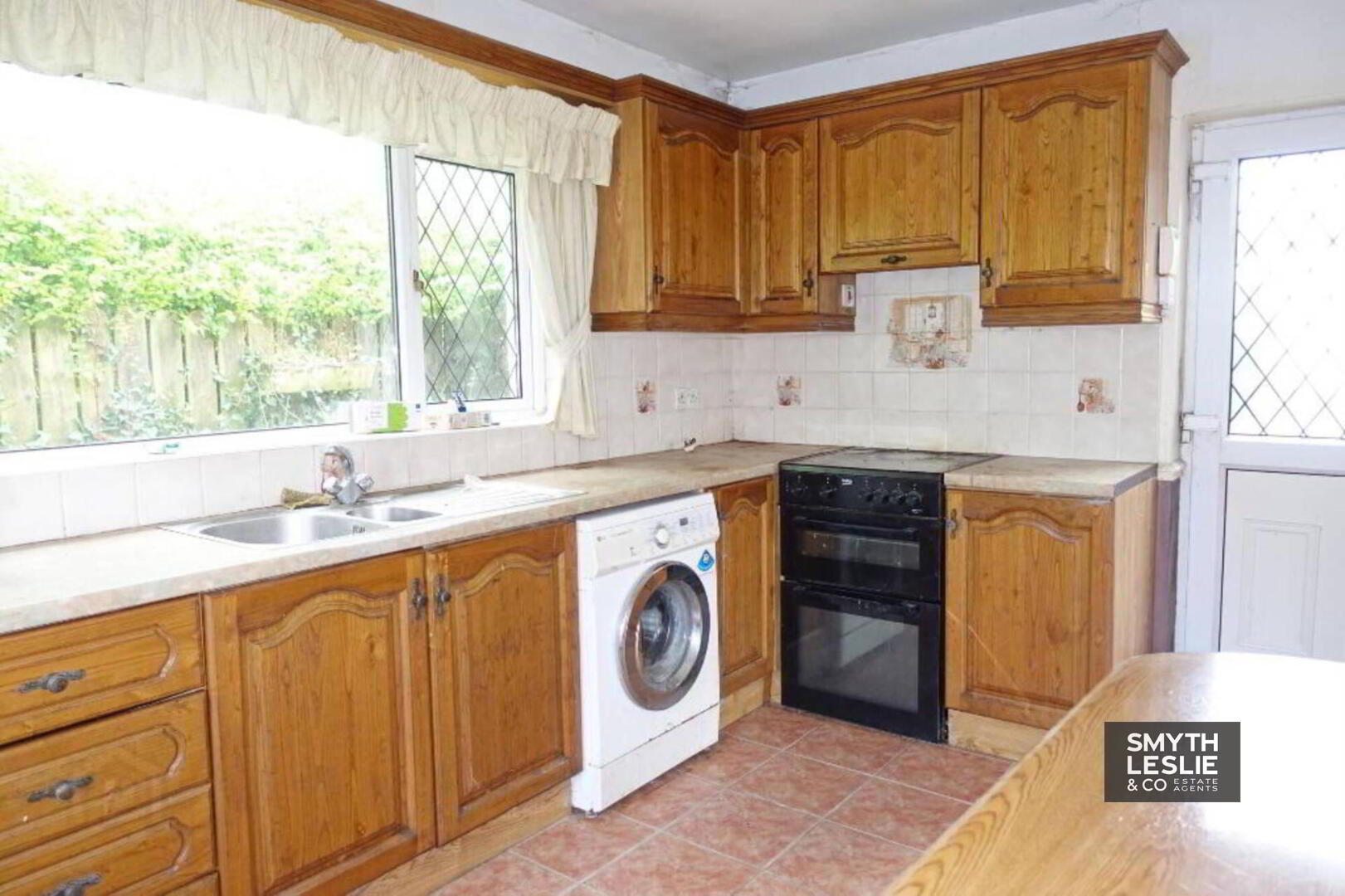 steel sink unit, extractor fan hood, plumbed for washing machine, tiled floor and splash back, PVC exterior door with glazed inset.