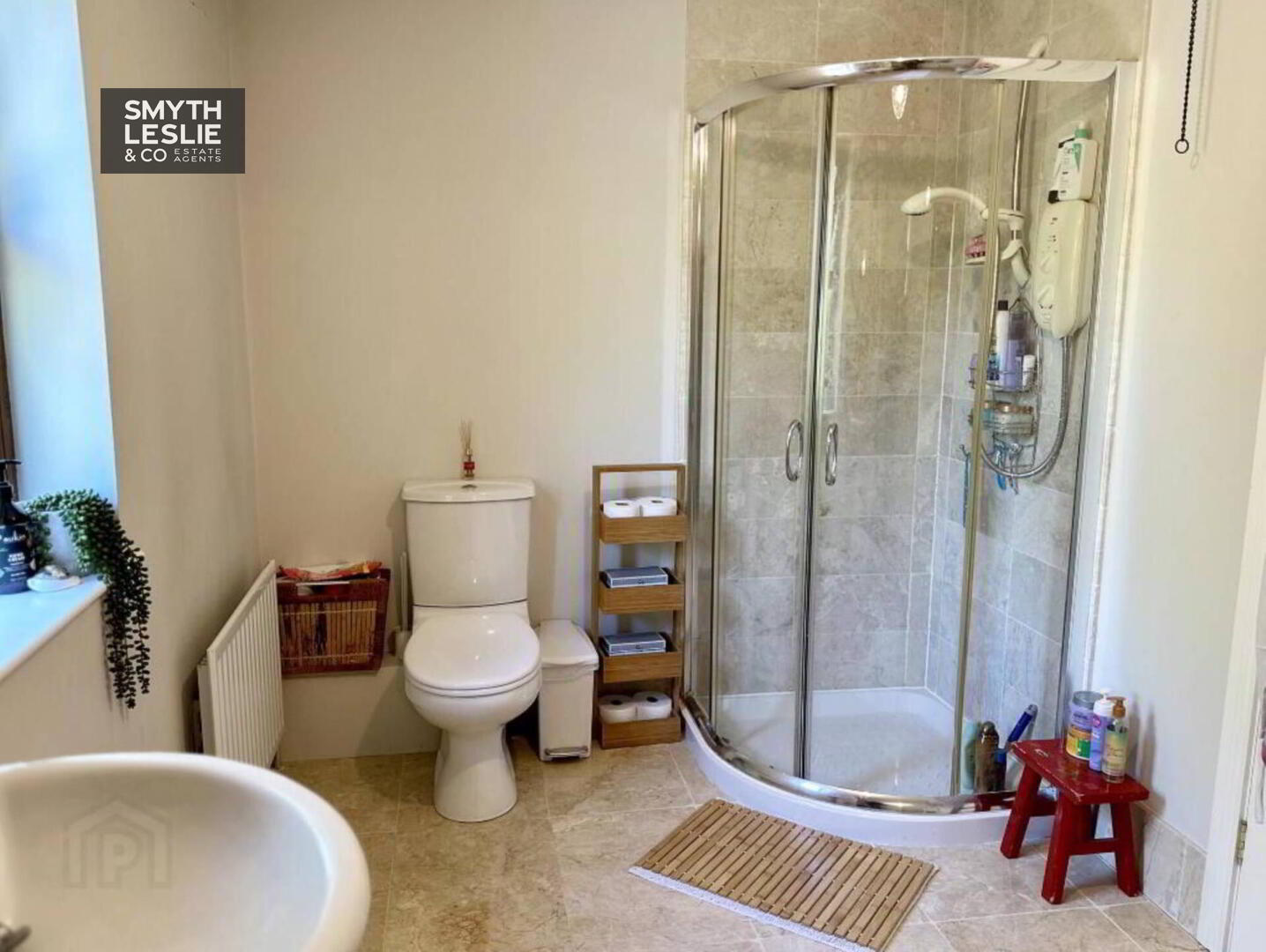 thermostatically controlled shower, tiled panelled bath, floor and splash back.