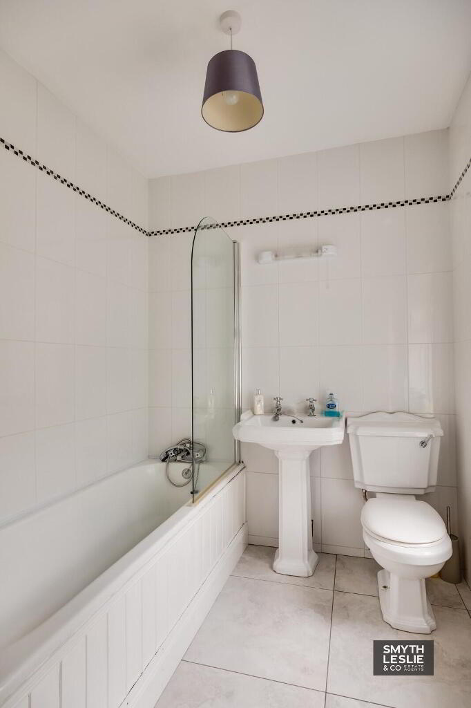 Bathroom: 6'5 x 6'5 White suite, shower screen to bath, fully tiled.