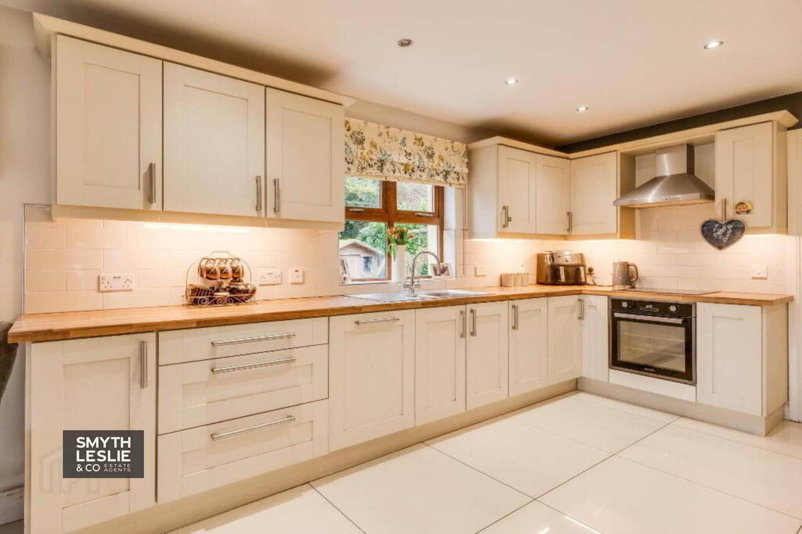 fan hood, tiled floor & splash back,