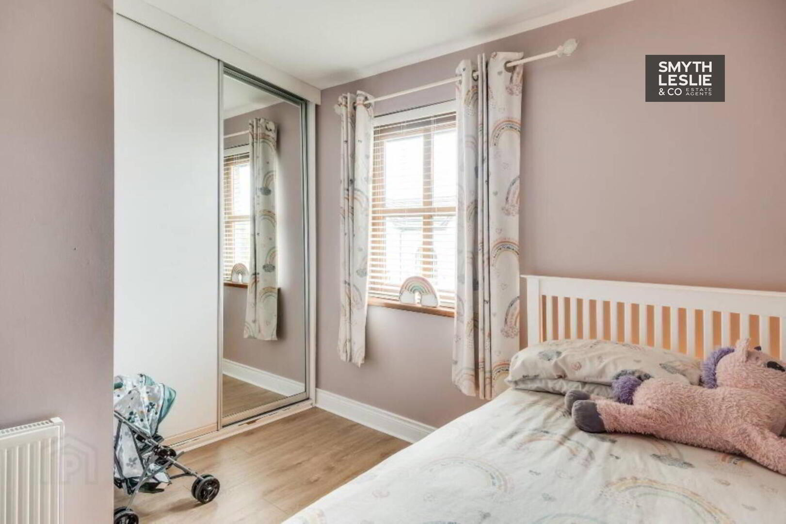mirrored door, laminate flooring.