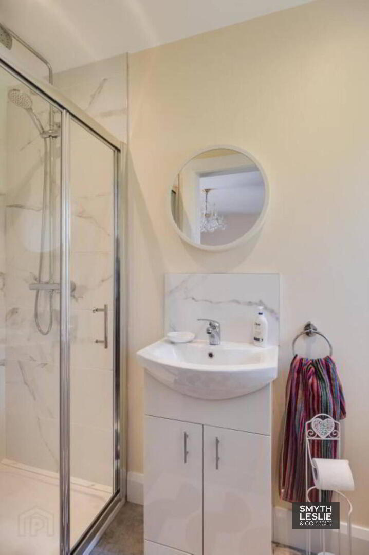 White suite, step in shower cubicle, thermostatically controlled shower, laminate flooring, PVC protective wall panelling.