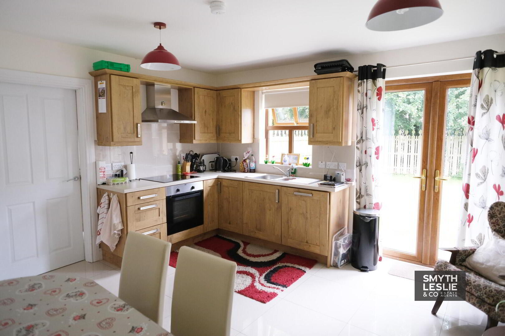 With stainless steel sink unit, range of high and low level cupboards, tiled in between, electric hob and oven, extractor hood, dishwasher, tiled floor, French doors opening out to private rear garden.