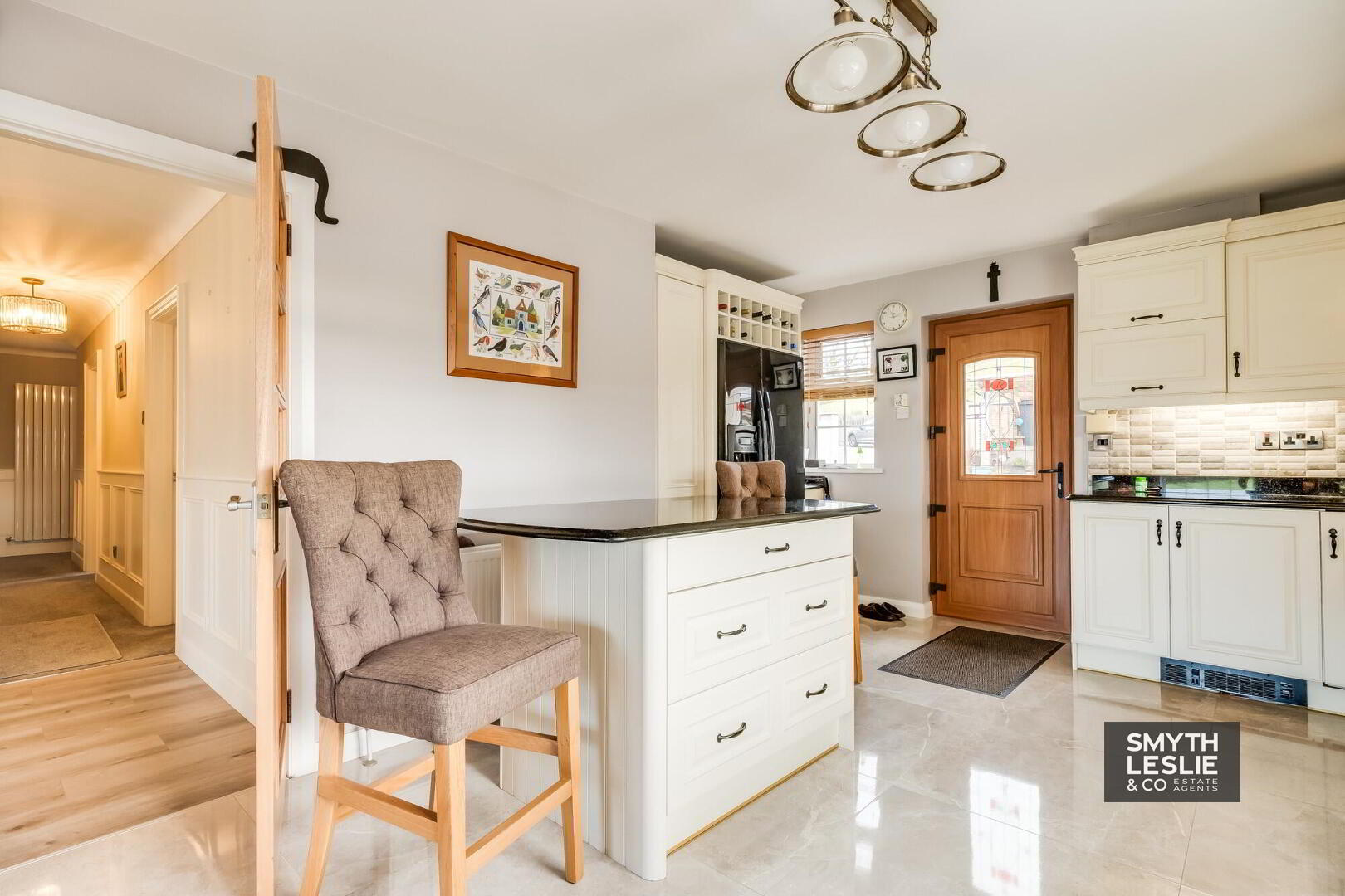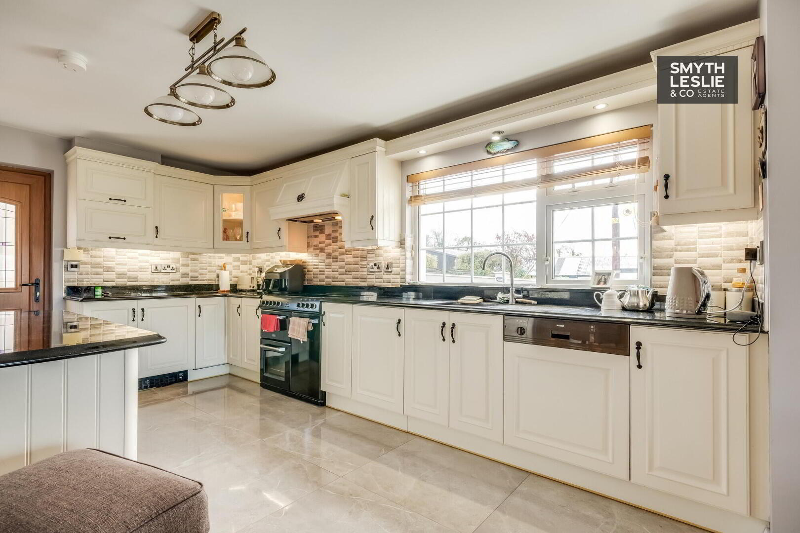 Modern fitted kitchen with a range of high & low level units, integrated dishwasher, Kensington Range cooker, extractor fan hood, granite work top & drainer board, stainless steel sink, island unit with breakfast bar lip, plumbed for American fridge freezer, wine rack, tiled floor & splash back, under unit lighting, Oak PVC exterior door with glazed inset, glazed door to hallway, views towards Enniskillen & Belmore mountain, ceiling cornice & moulded centrepiece.