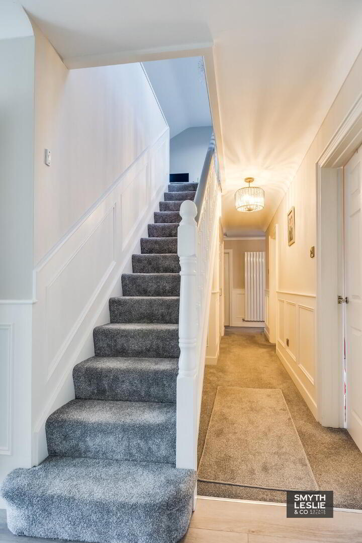 Moulded wall panelling, hotpress, wall mounted tall radiator, staircase.