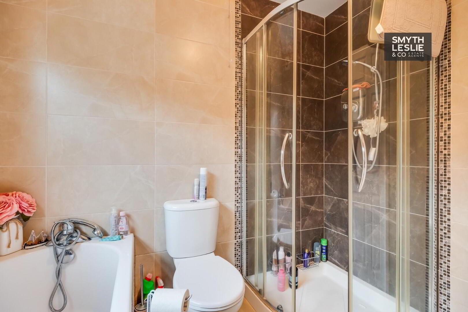 White suite, step in shower cubicle with electric shower, fully tiled, heated towel rail.