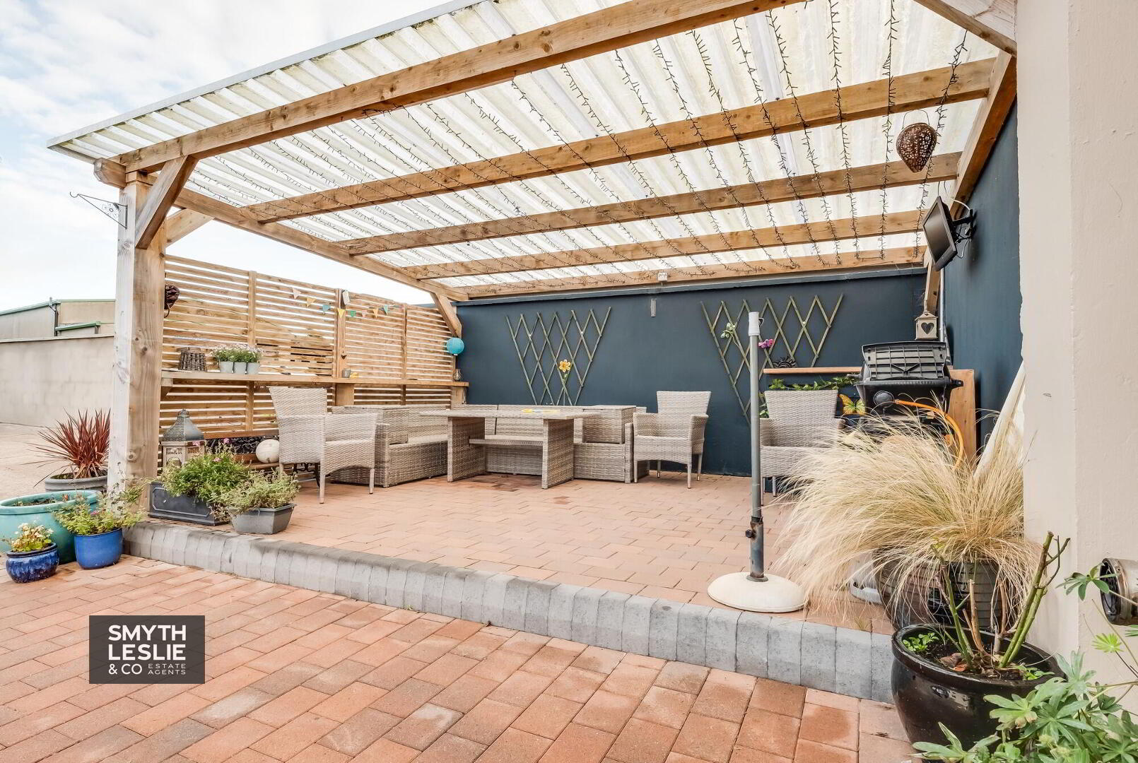 The property is set within beautifully matured grounds that perfectly complement its charming country setting. To the front, an attractively landscaped garden creates a welcoming approach, framed by well-tended lawns and established planting that provide colour and character throughout the seasons. To the rear, an extensive parking area offers excellent space for vehicles, further enhanced by a substantial garage providing additional storage and practical convenience. A feature raised and covered patio area completes the outdoor, offering an ideal space for entertaining, dining, or simply relaxing while enjoying the tranquil surroundings.