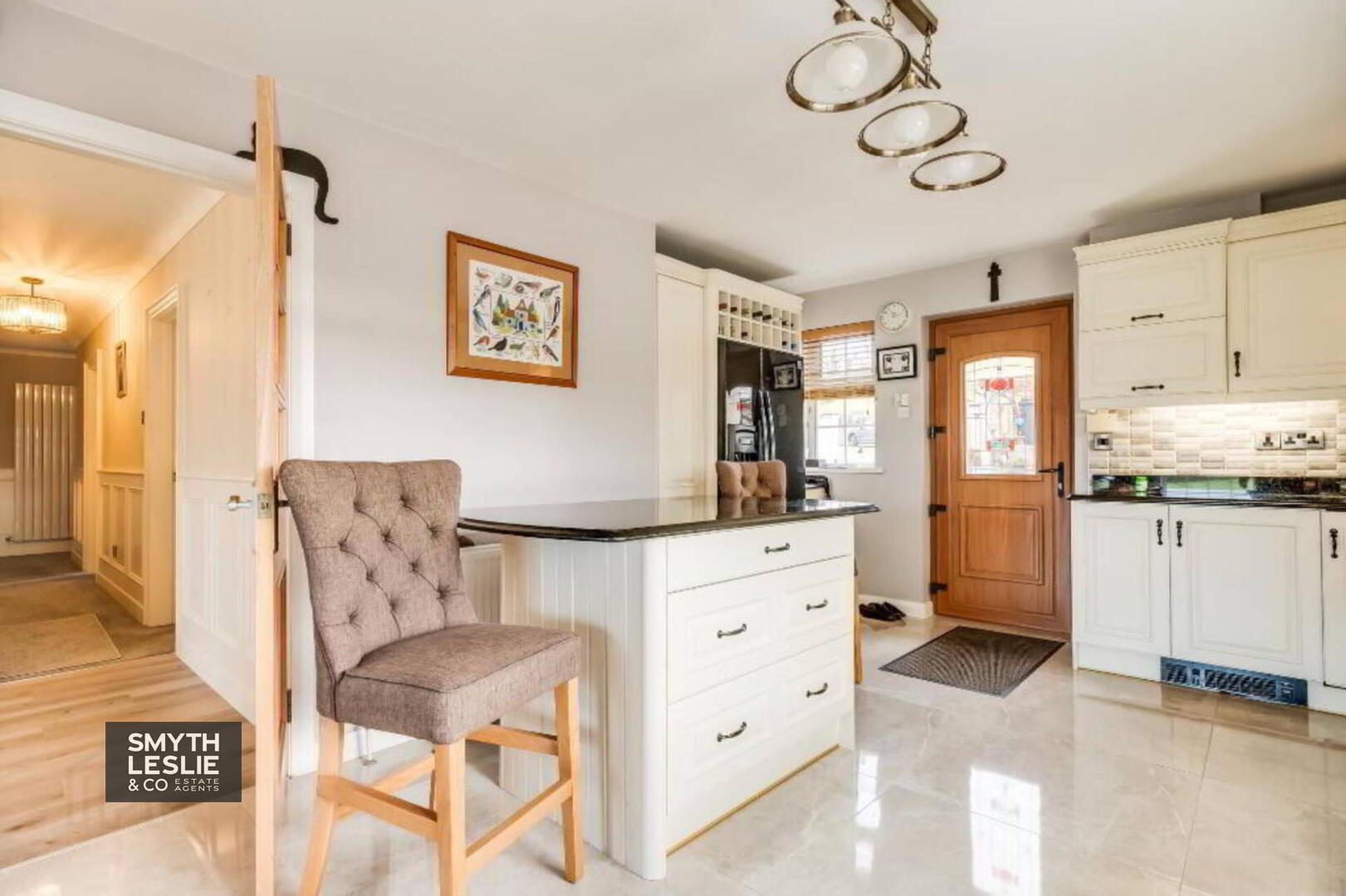 extractor fan hood, granite work top & drainer board, stainless steel sink, island unit with breakfast bar lip, plumbed for American fridge freezer, wine rack, tiled floor & splash back, under unit lighting, Oak PVC exterior door with glazed inset, glazed door to hallway, views towards Enniskillen & Belmore mountain, ceiling cornice & moulded centrepiece.