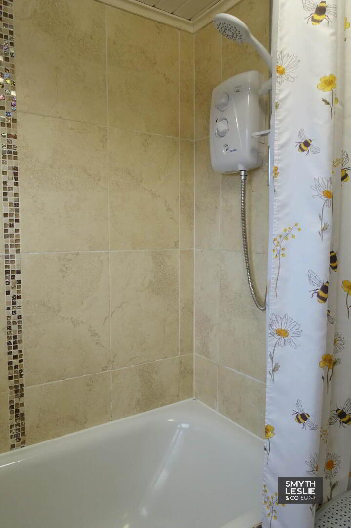 White suite, electric shower over bath, PVC protective cladding to ceiling, fully tiled, Hotpress