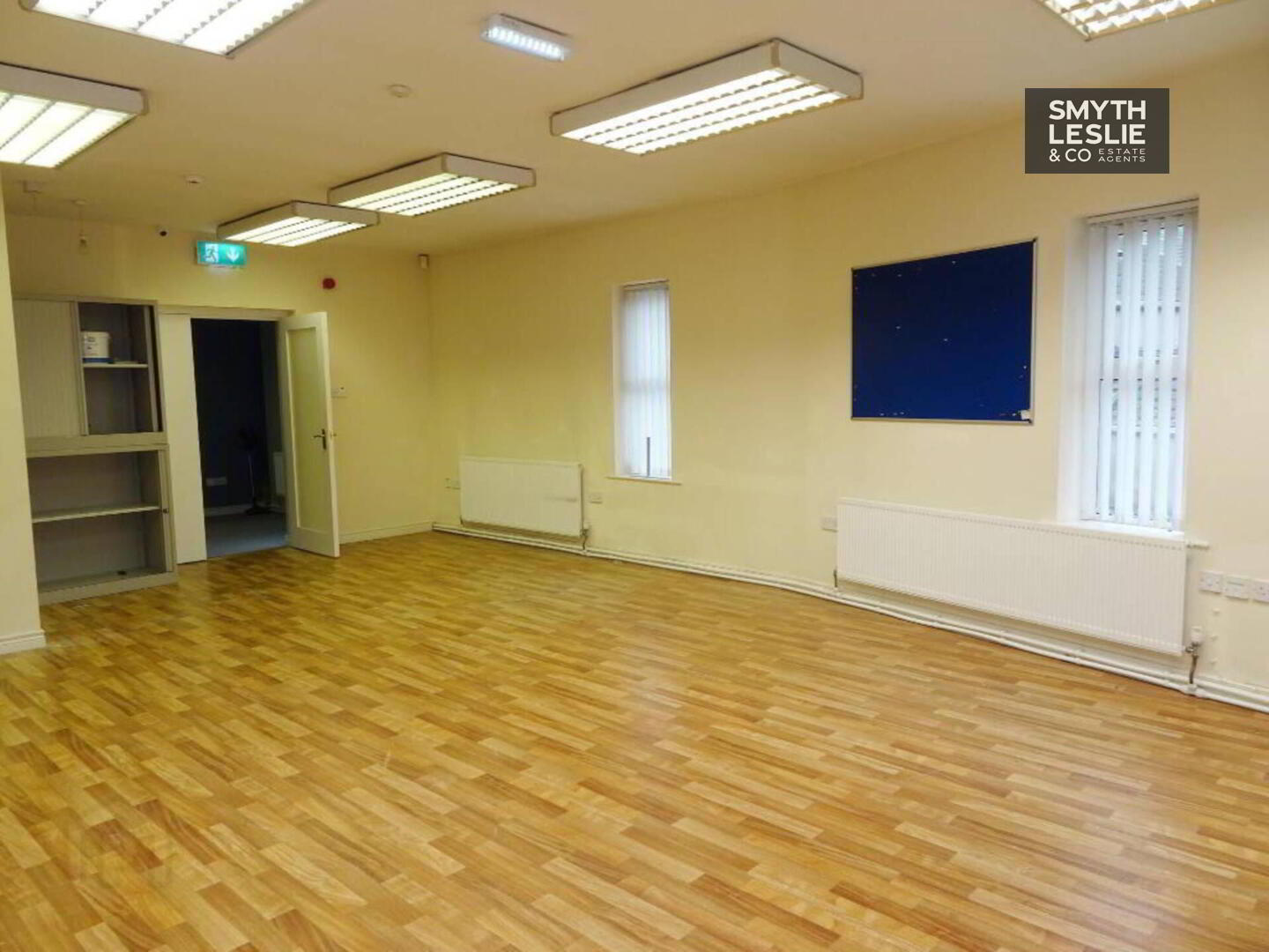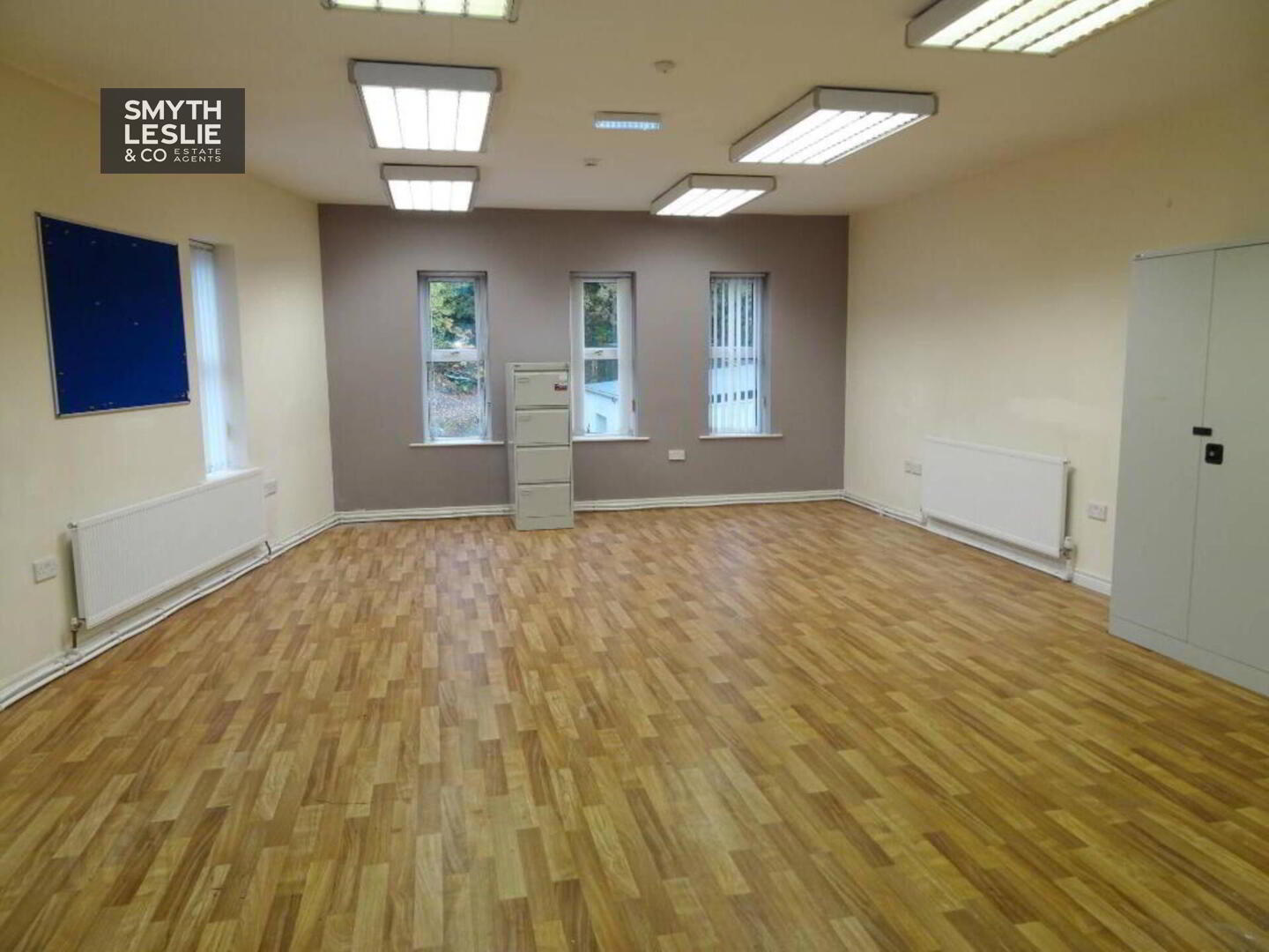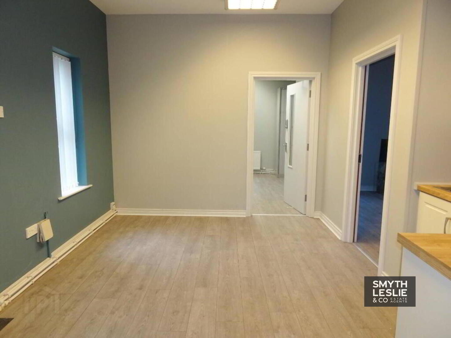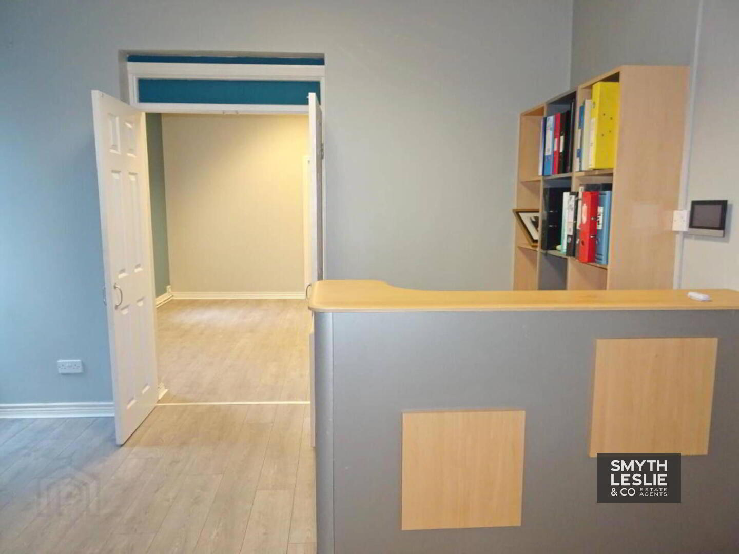 Fitted reception desk, laminate floor.