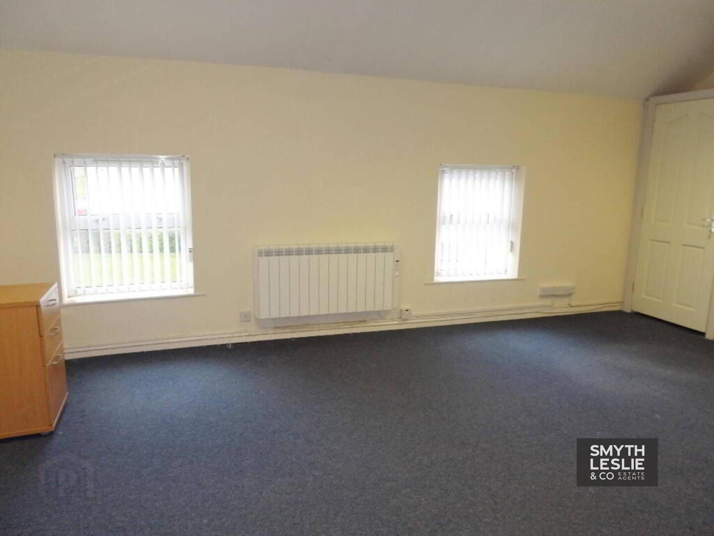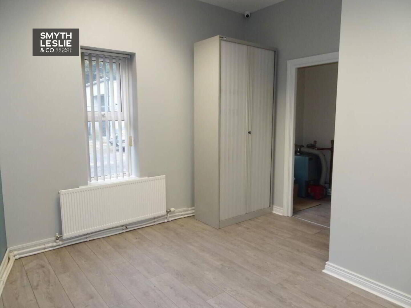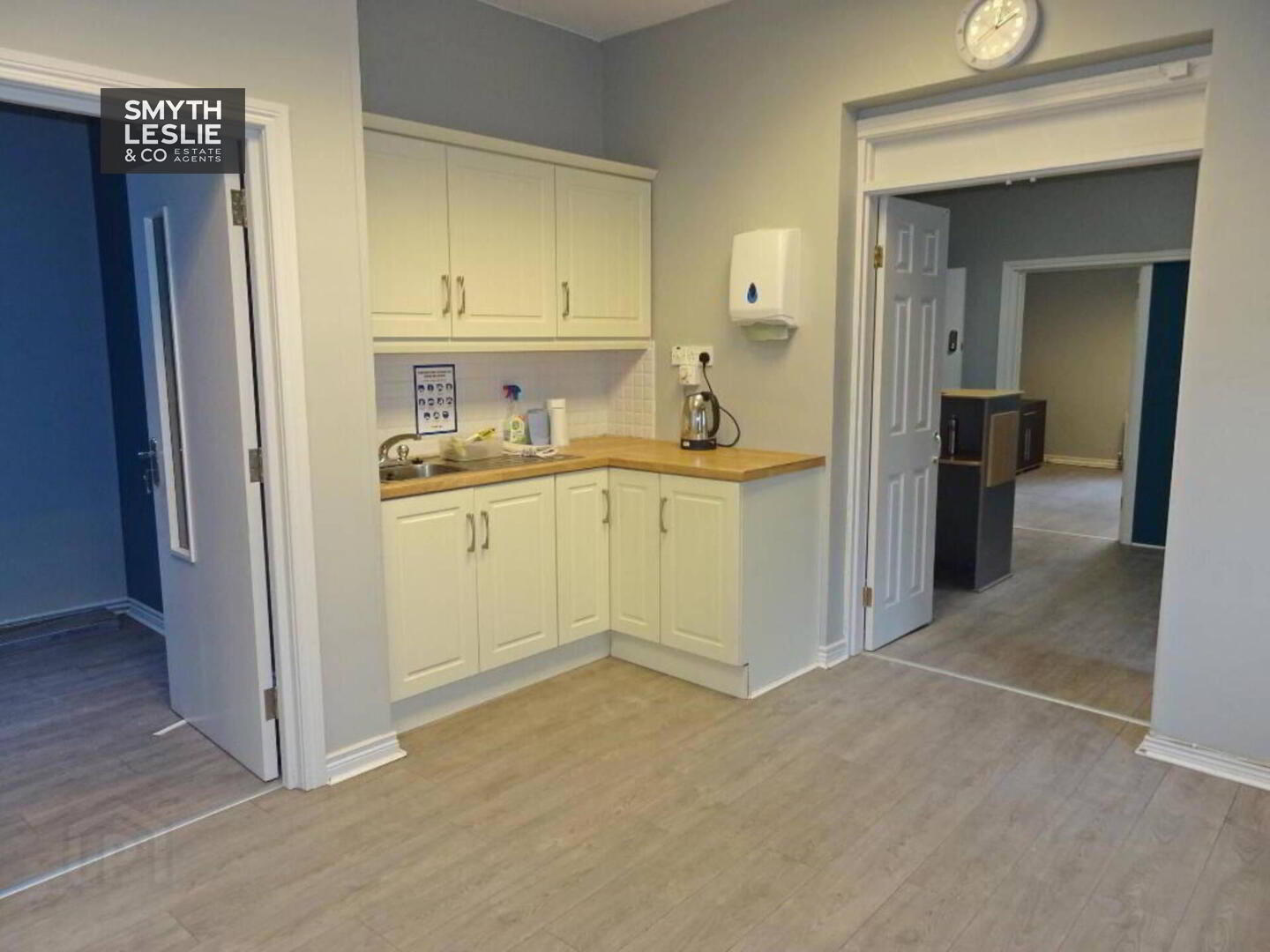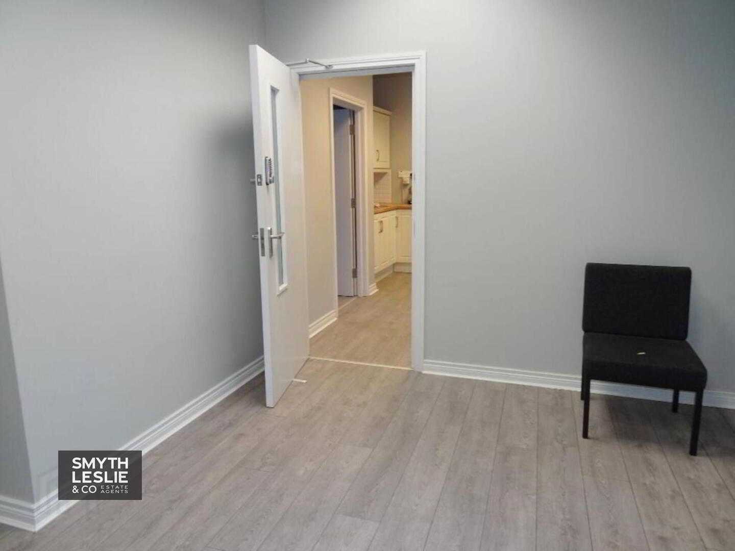 Fitted reception desk, laminate floor.