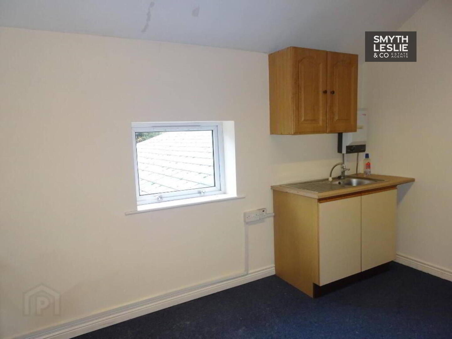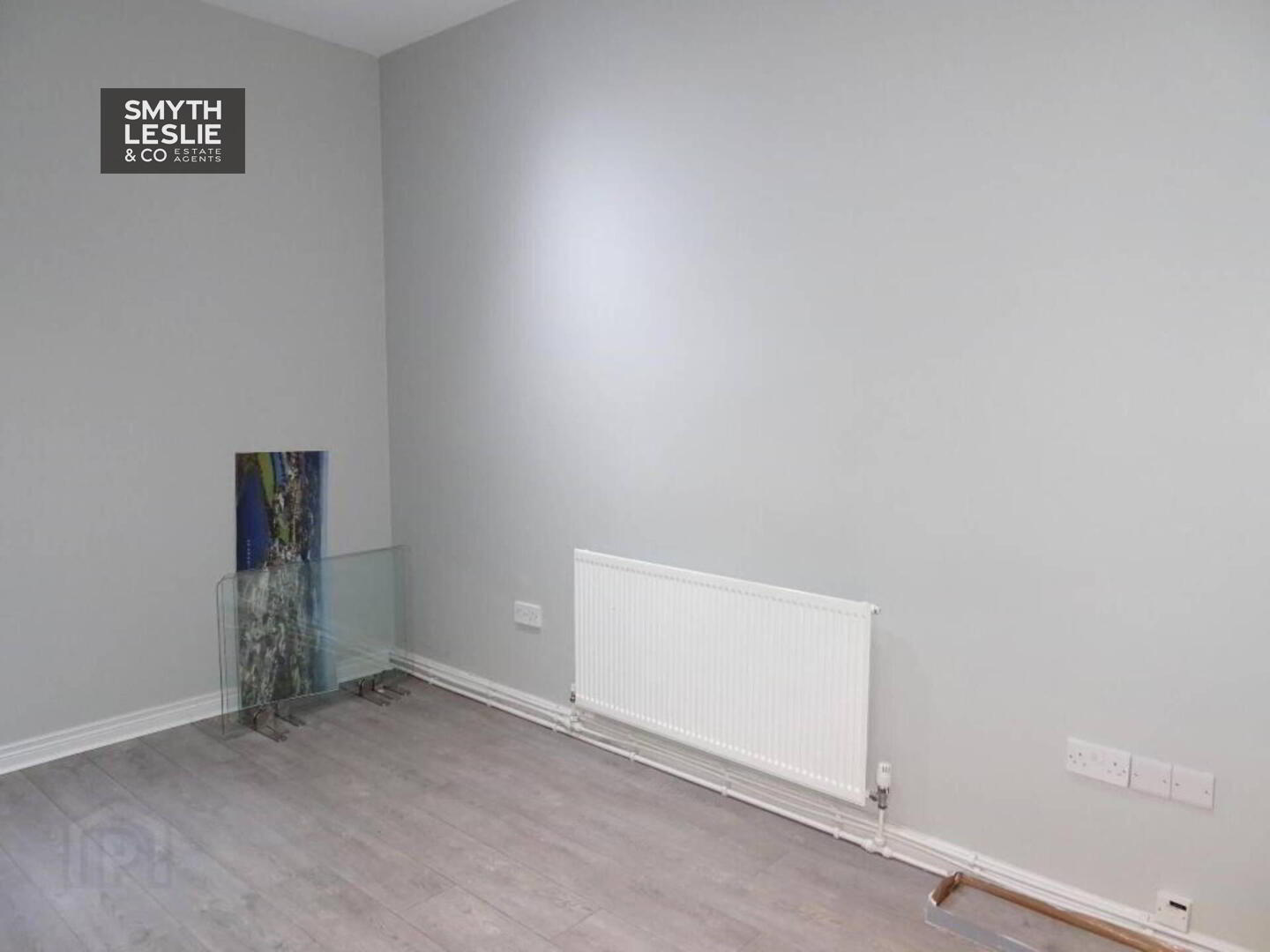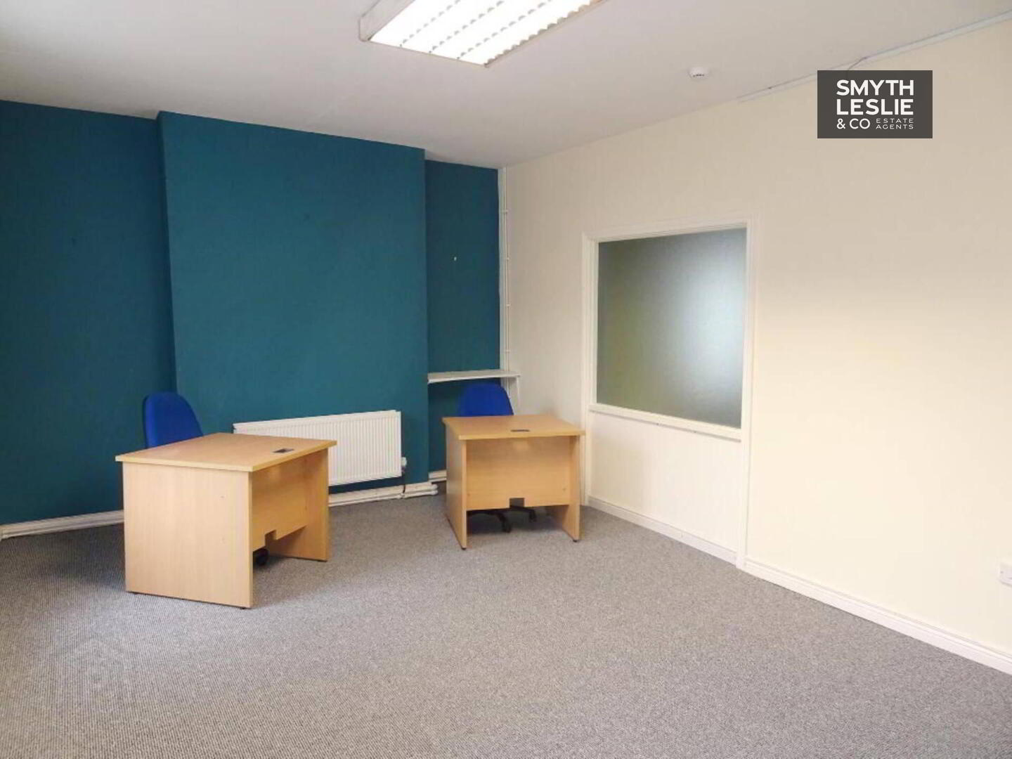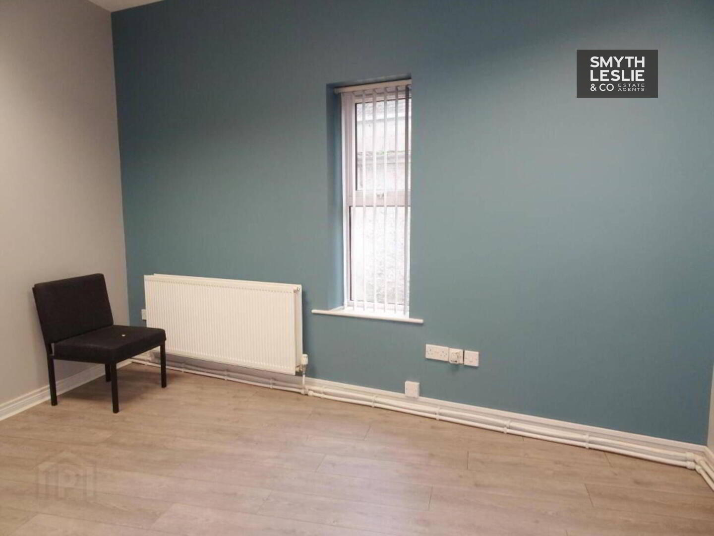 Fitted reception desk, laminate floor.
