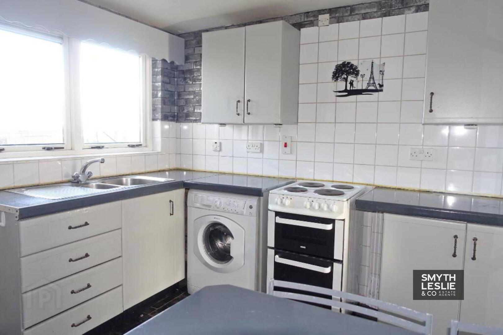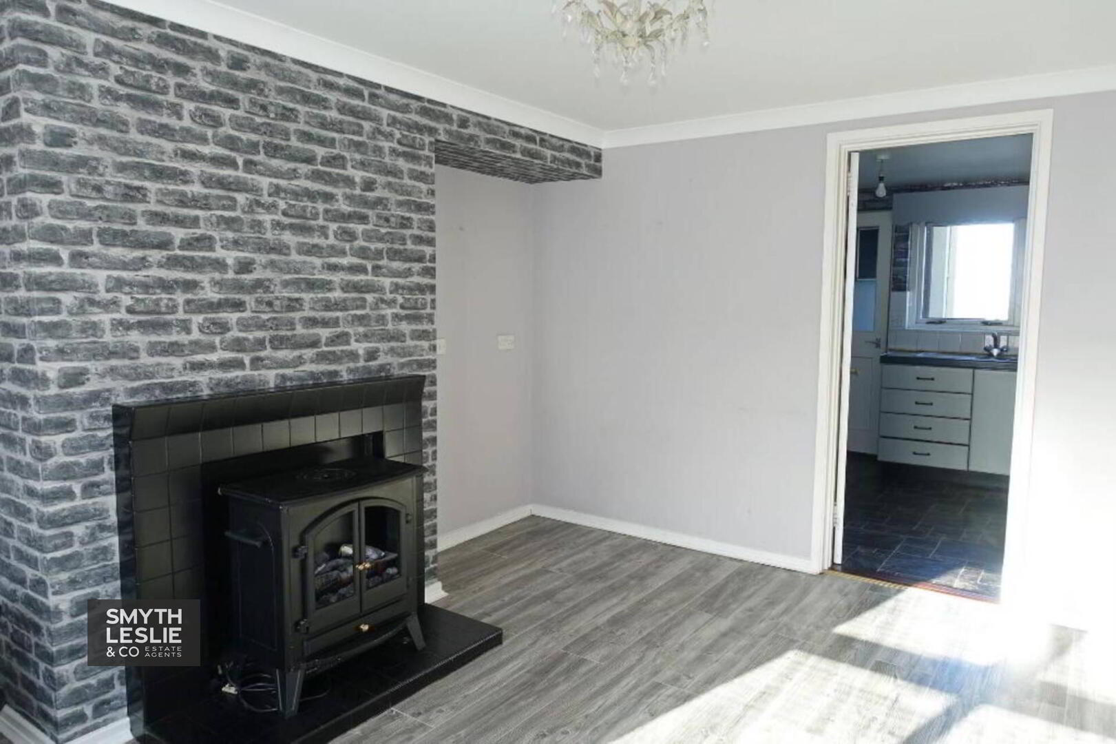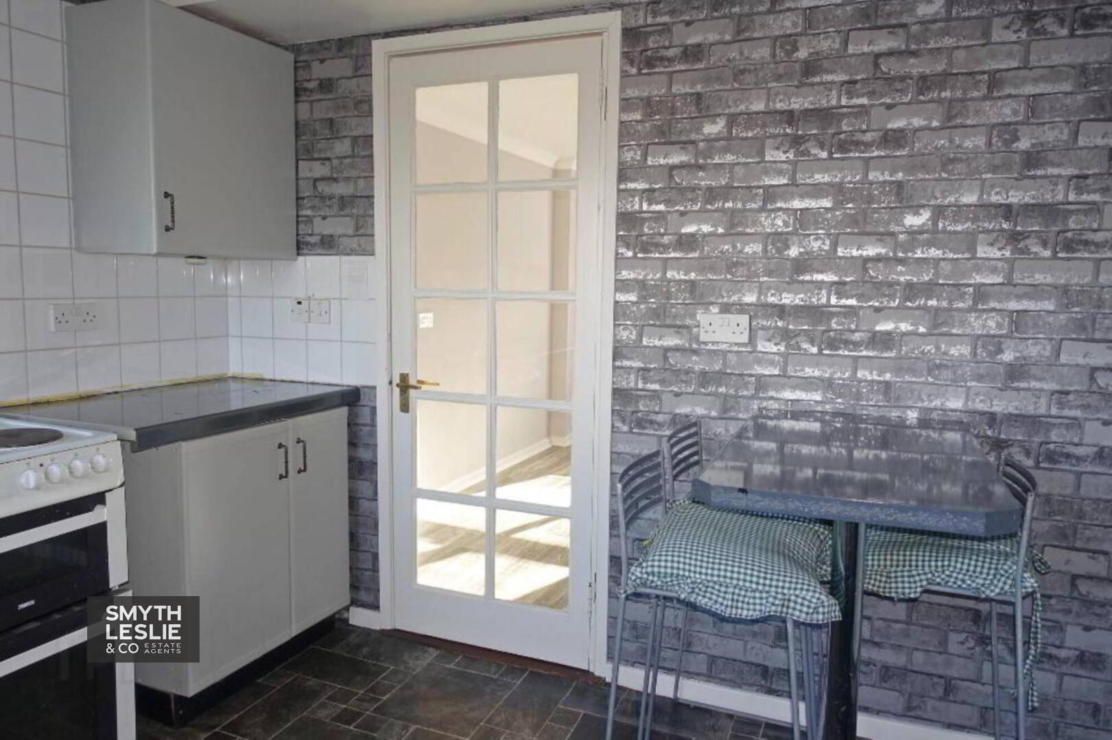 Glazed exterior door, laminate flooring, hot press.