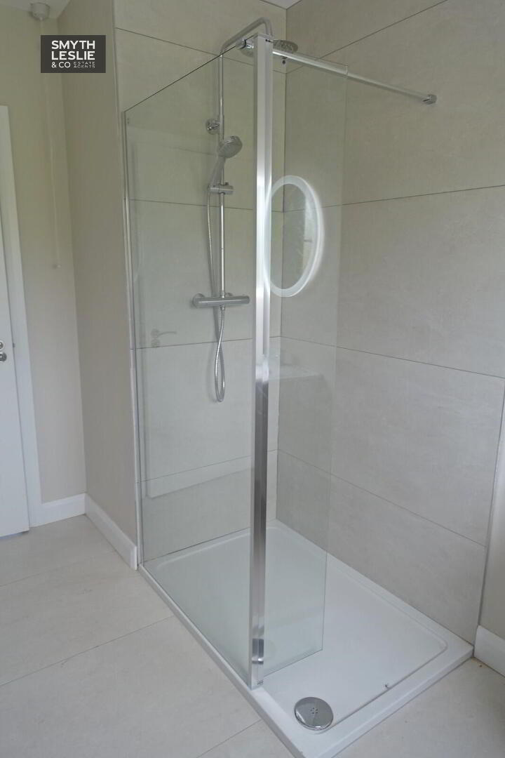 White suite, shower cubicle with thermostatically controlled shower, tiled floor & splash back, heated towel rail.