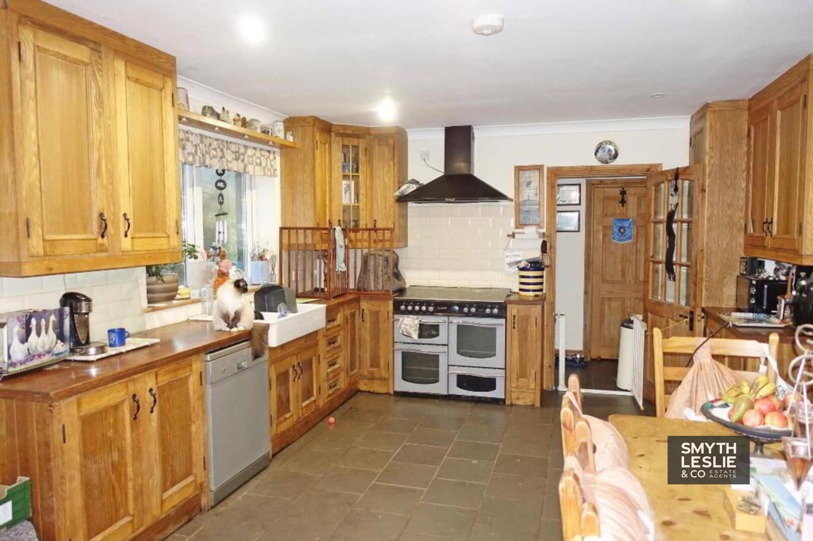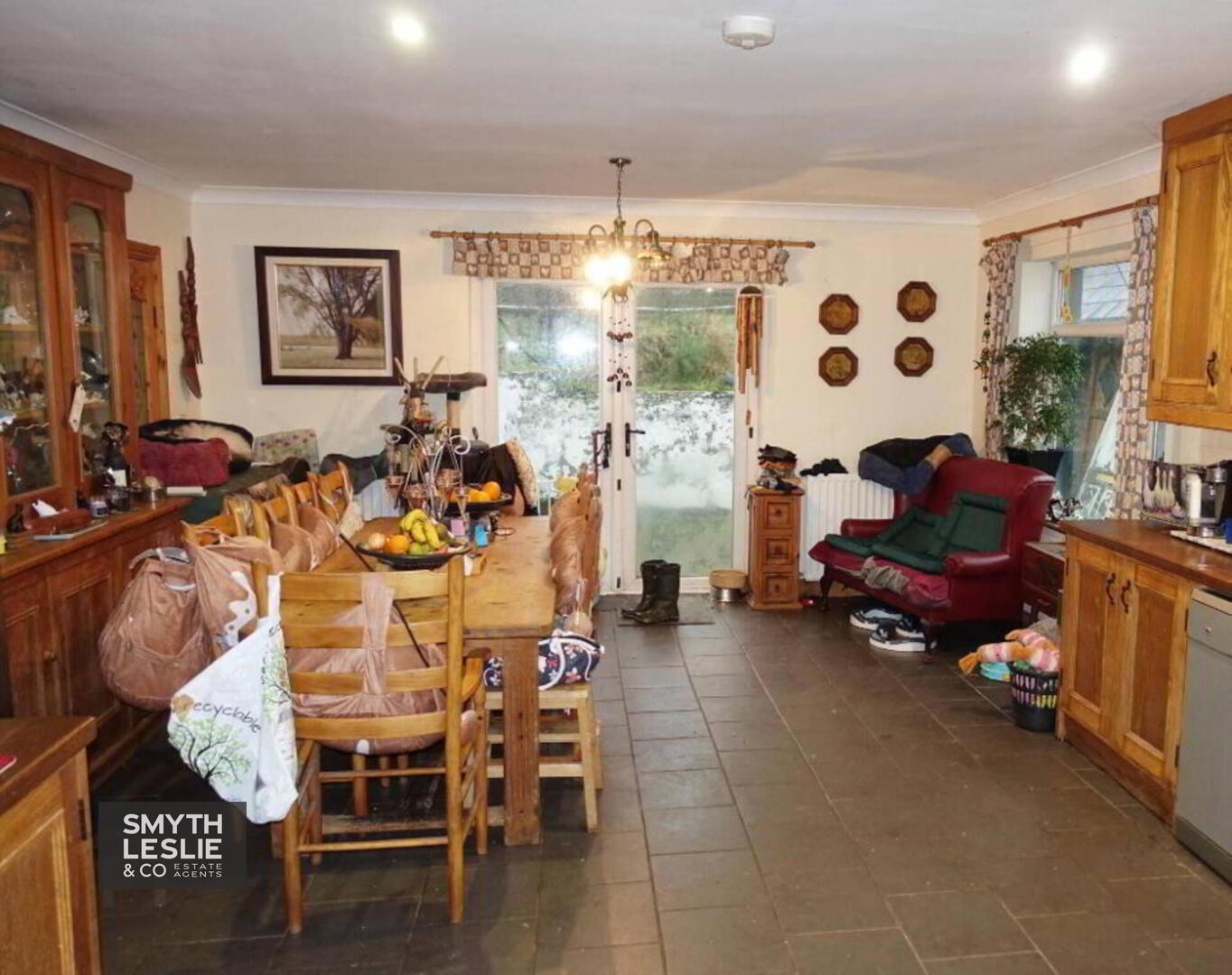 with kitchen incorporating Belfast sink unit, full range of high and low level cupboards, tiled in between, spot lighting coving, tiled floor, connecting door to Living Room, French doors off Dining Area.