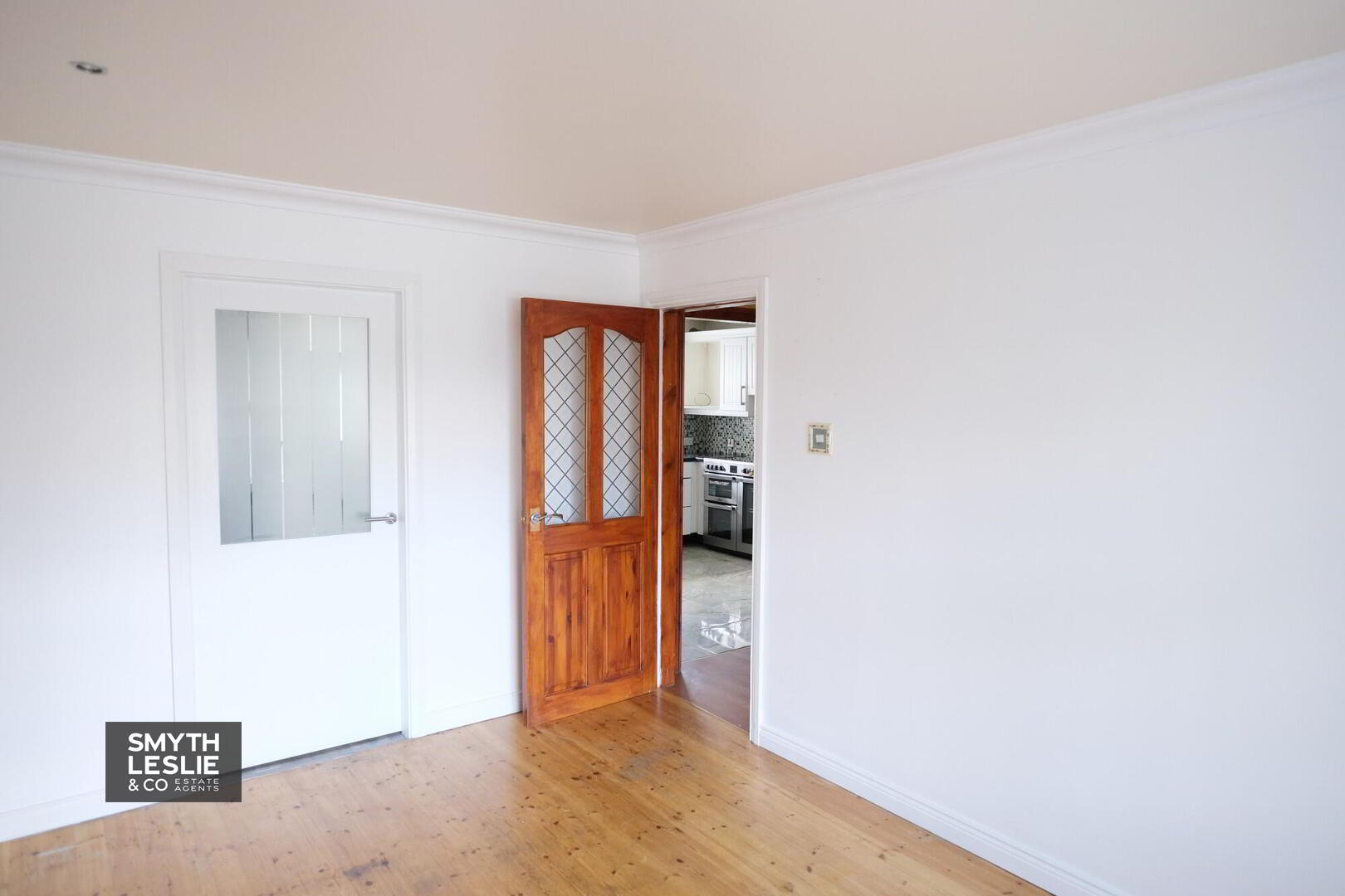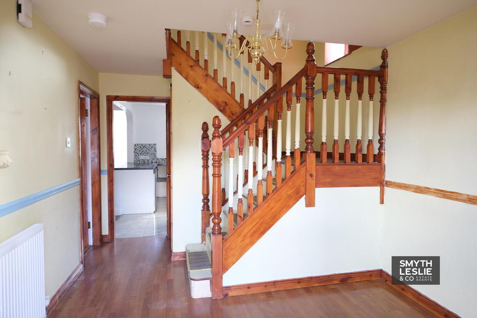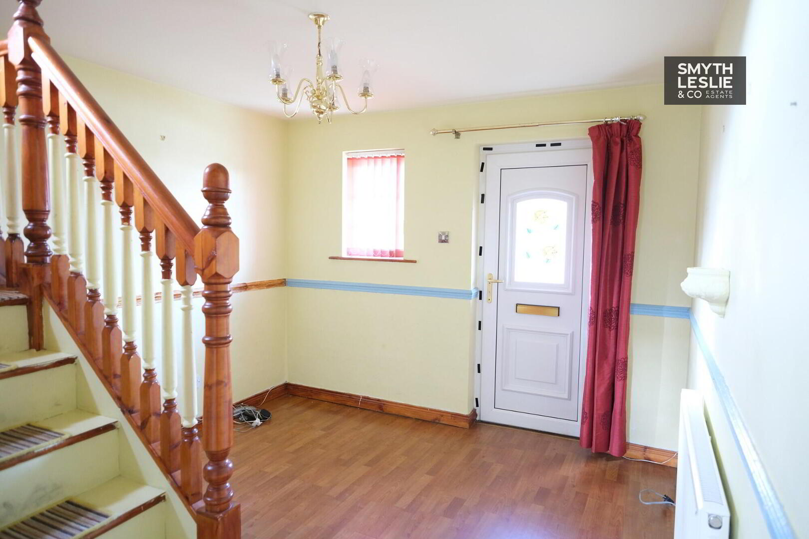 With storage cupboard under stairs, dado rail, PVC exterior door, laminated floor.