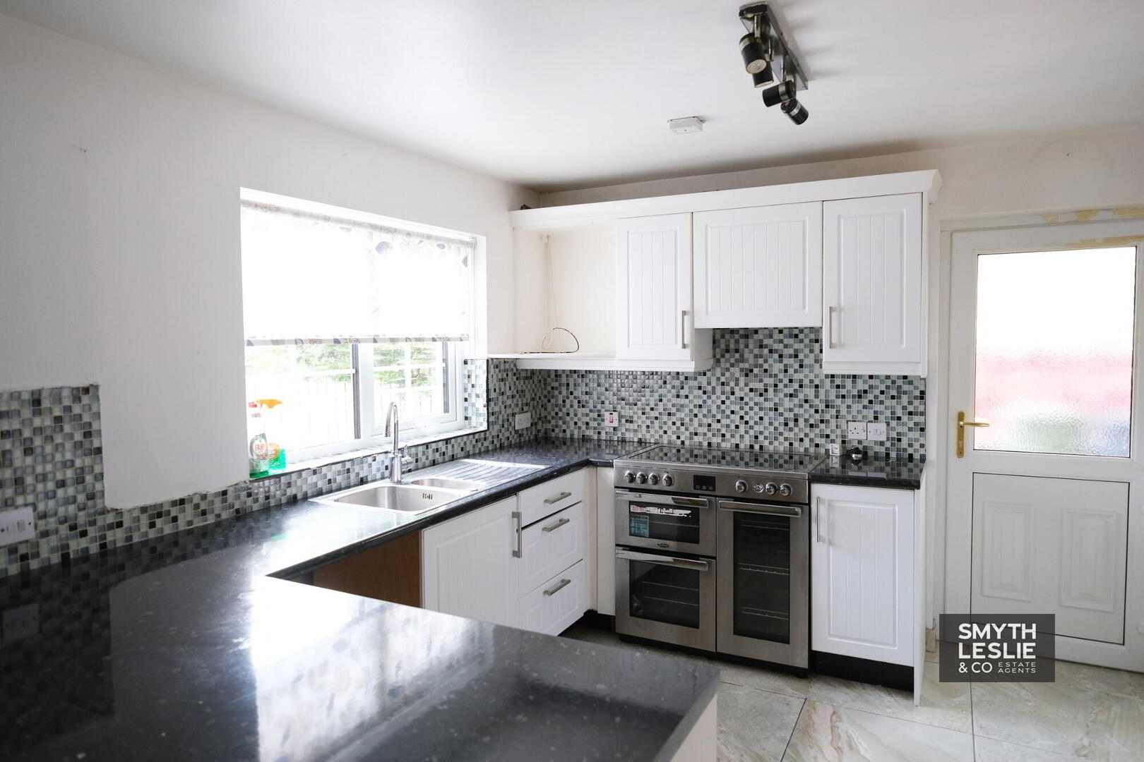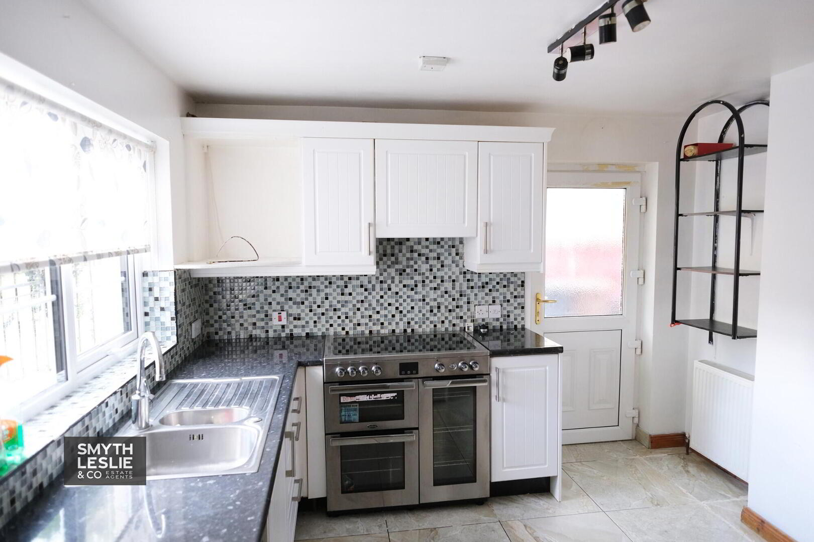 With stainless steel sink unit, full range of high and low level cupboards, tiled in between, electric cooker, extractor fan, plumbed for washing machine, spot lighting, PVC exterior door, tiled floor.