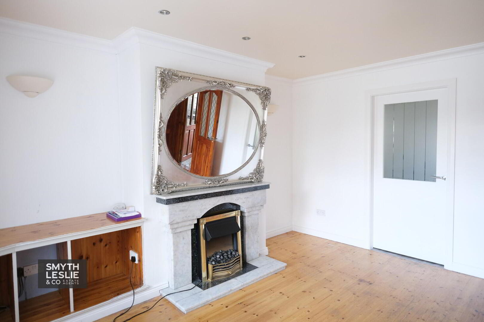 With granite surround fireplace and hearth, built in TV shelf, spot lighting, pitch pine floor, coving.