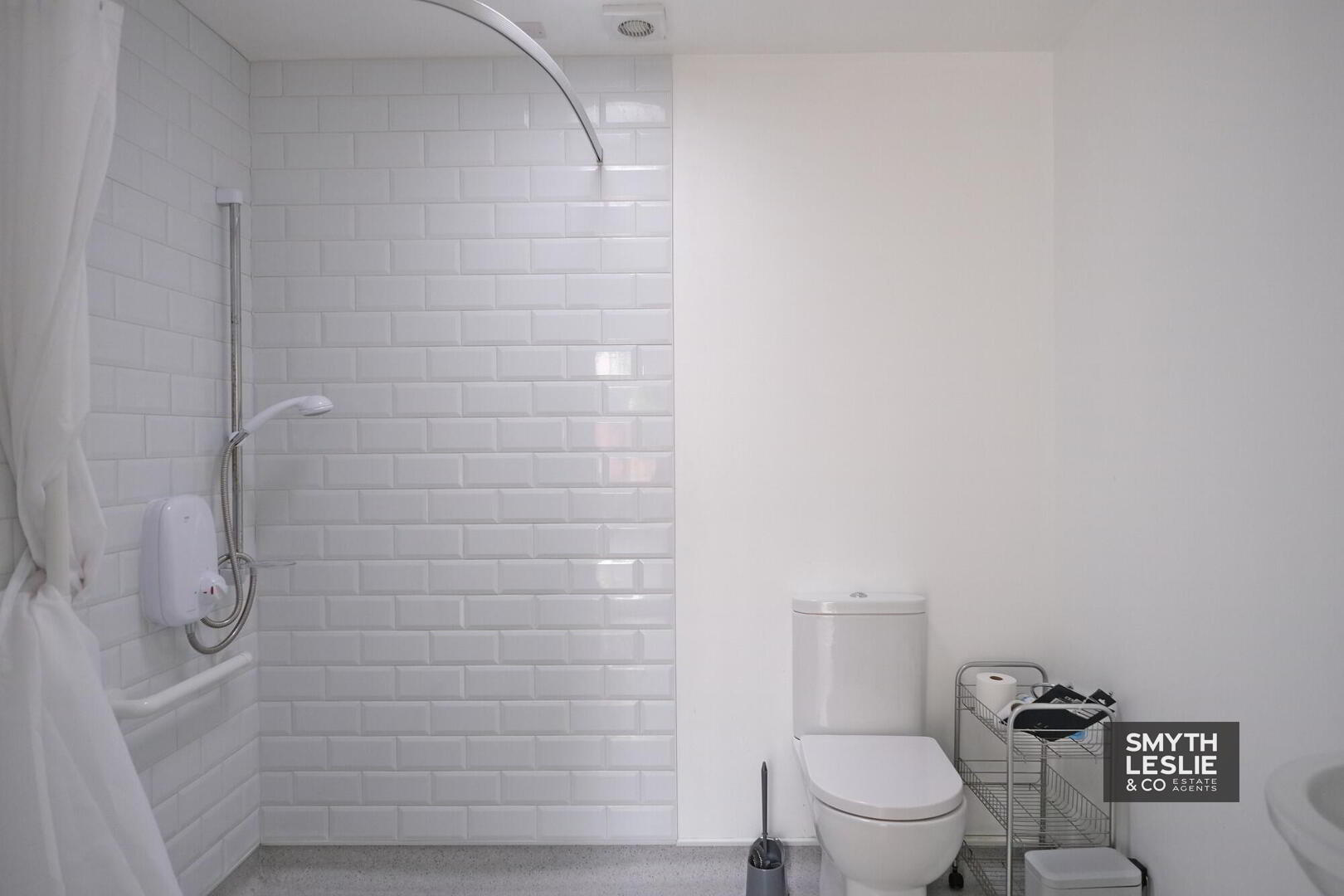 With electric shower, wc and wash hand basin, part tiled walls, skylight.