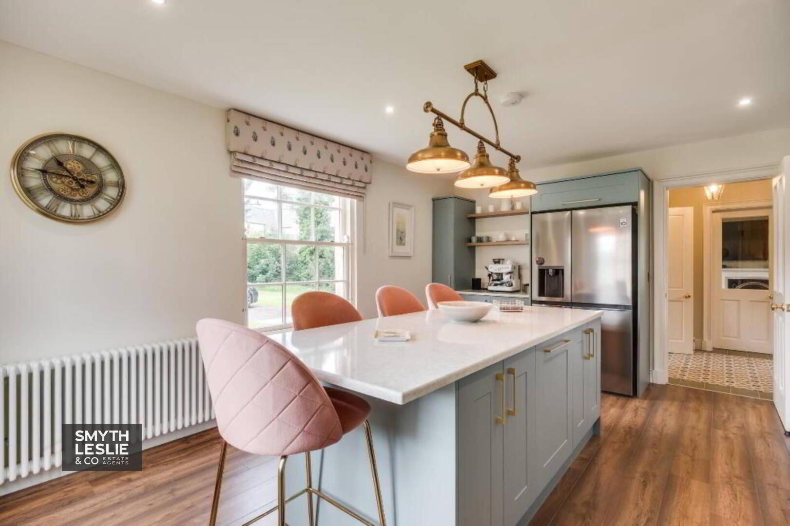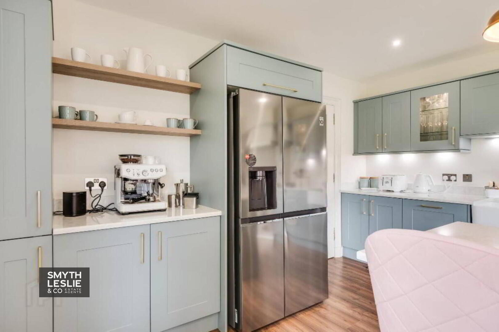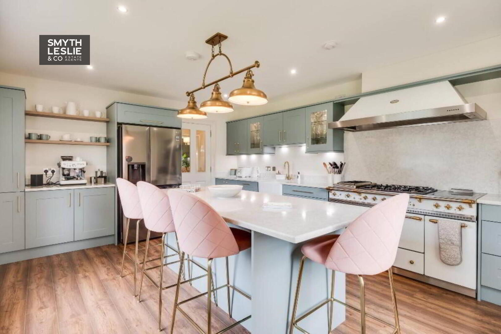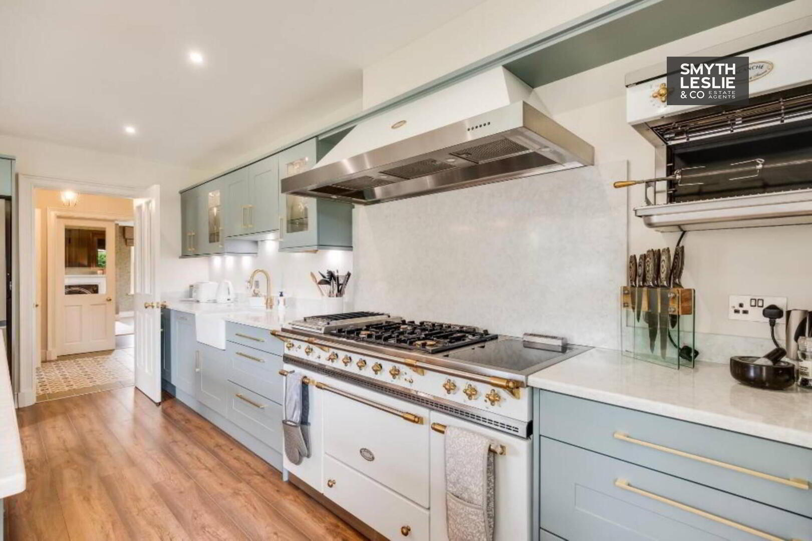 Range of high and low level units with slow closing doors, quartz worktops, Belfast sink, plumbed for American Style fridge freezer, integrated dishwasher, Lacanche Citeaux Range Cooker, Lacanche extractor fan hood & Lancanche Wall Mounted Salamander Grill & Rotisserie, generous sized Island, laminate flooring.