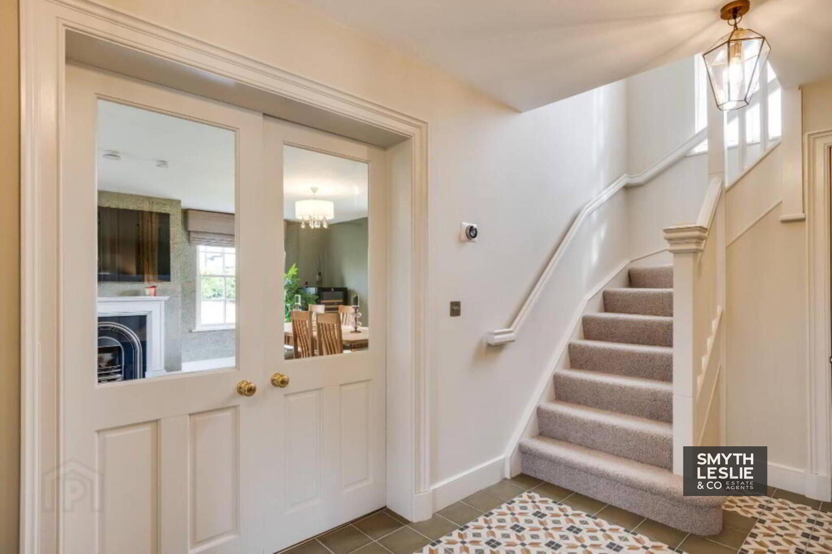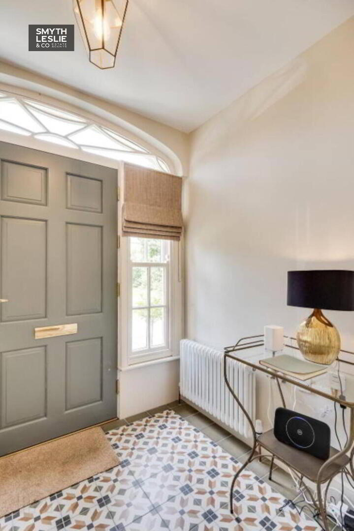 Solid wood exterior door with feature fanlight window, tiled floor, glazed door to Entrance Hall.