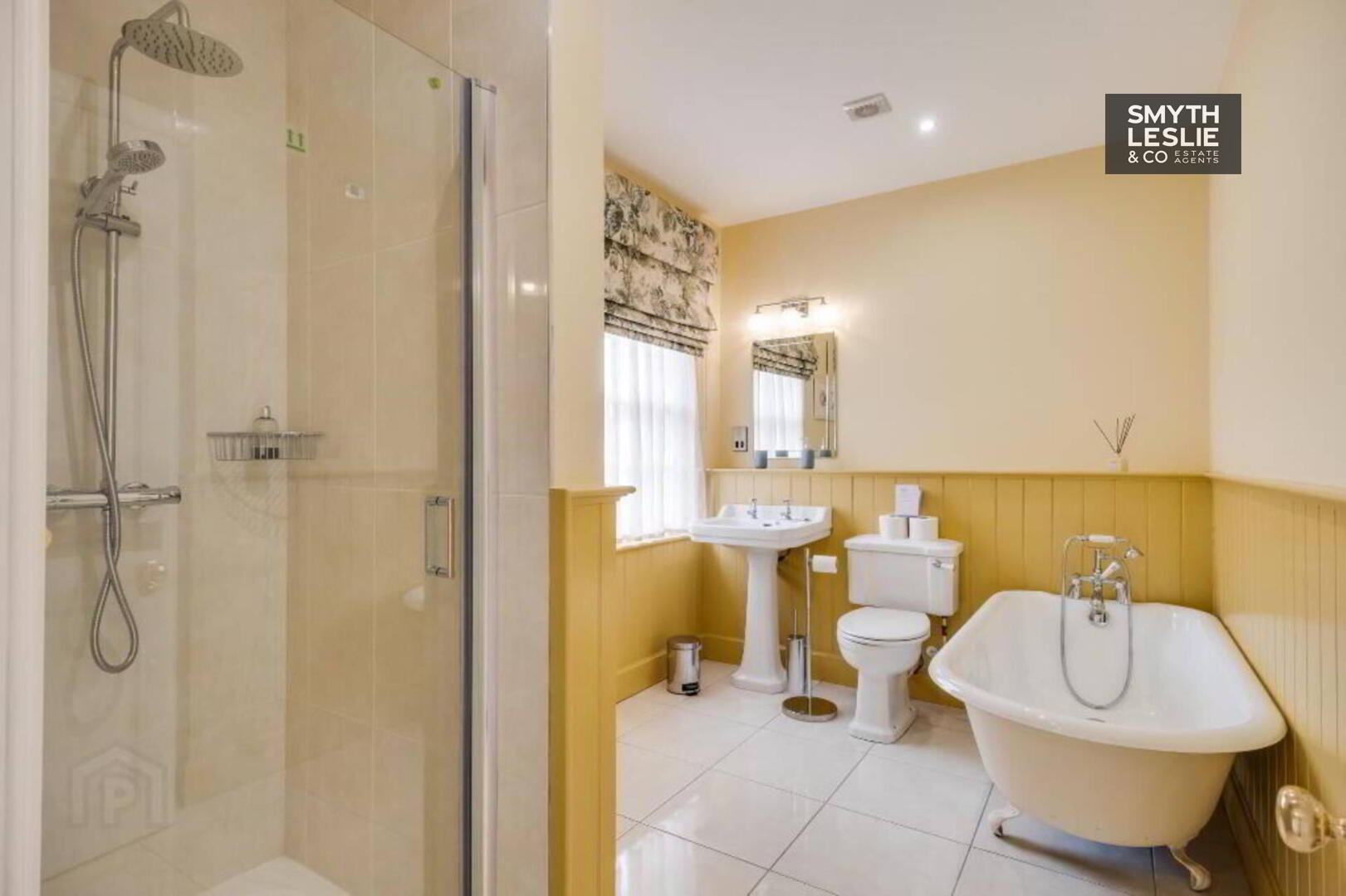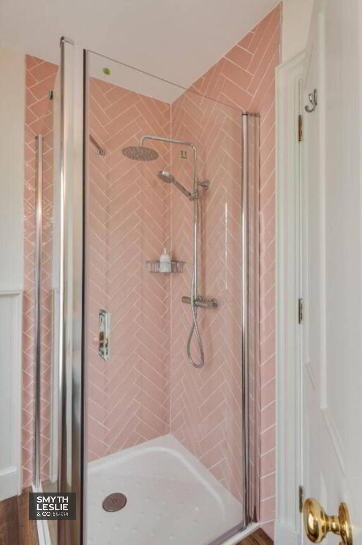 Luxury 3 piece suite with telephone hand shower attached to bath, step in shower cubicle with thermostatically controlled shower and tiled splashback, tongue & grove half wall panelling, heated towel rail, built in storage, tiled floor.