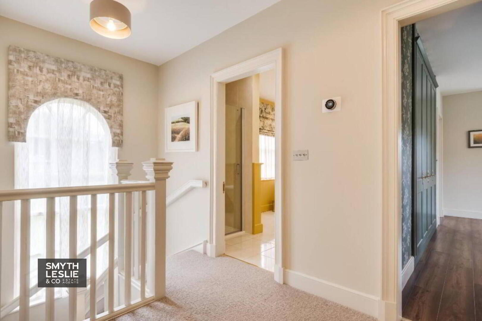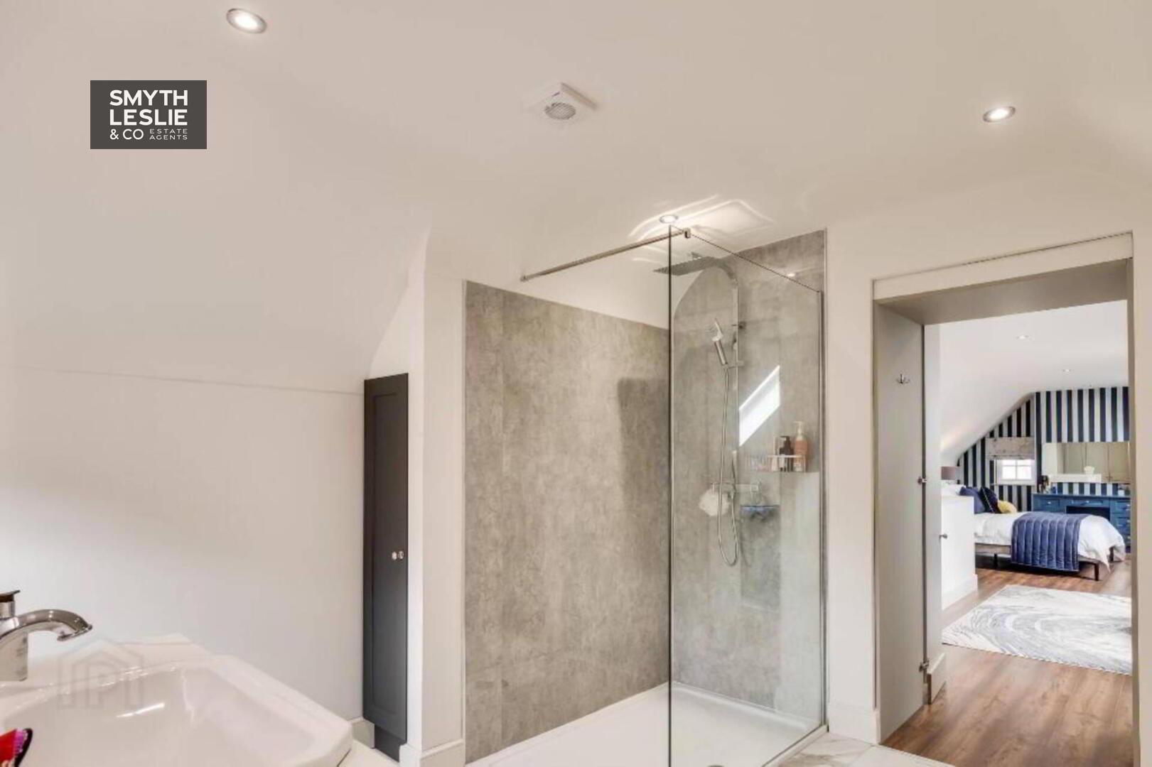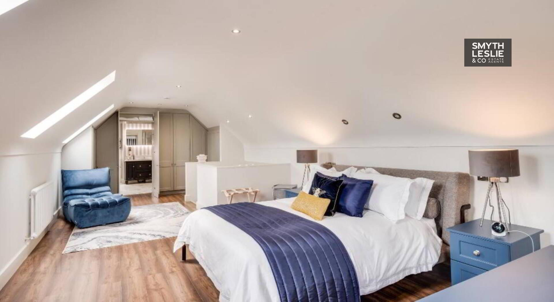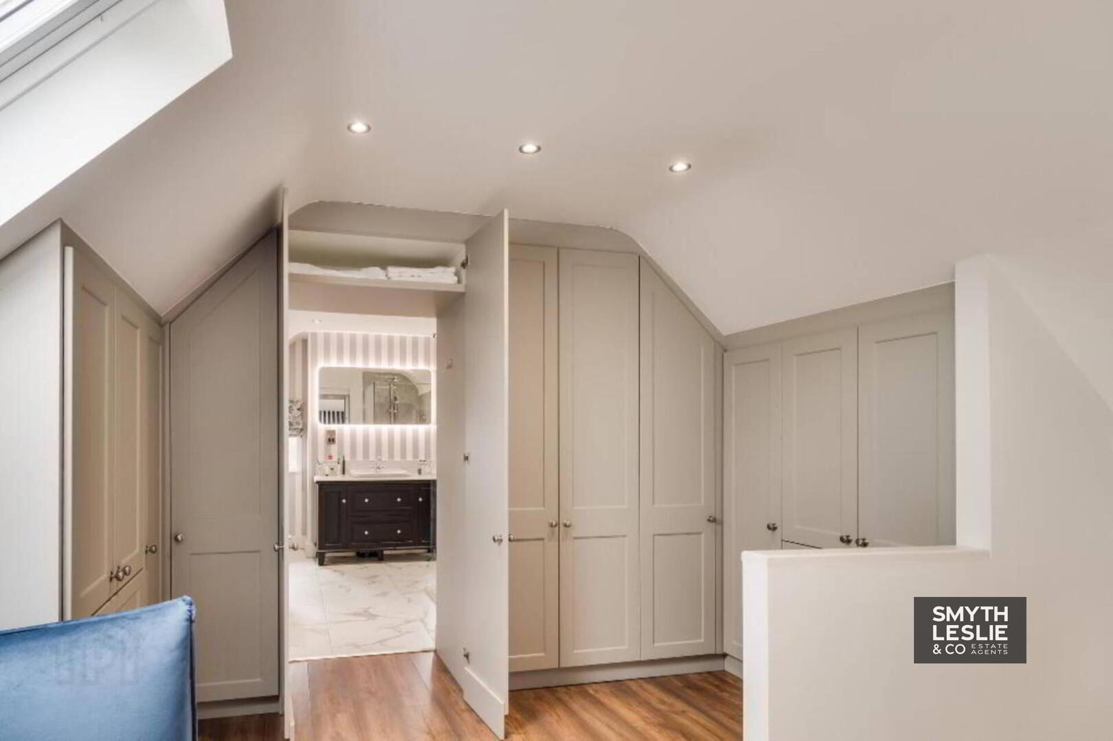 Fitted vanity unit, fitted wardrobes and storage, remote controlled electric roller blinds, laminate flooring, recessed lighting.