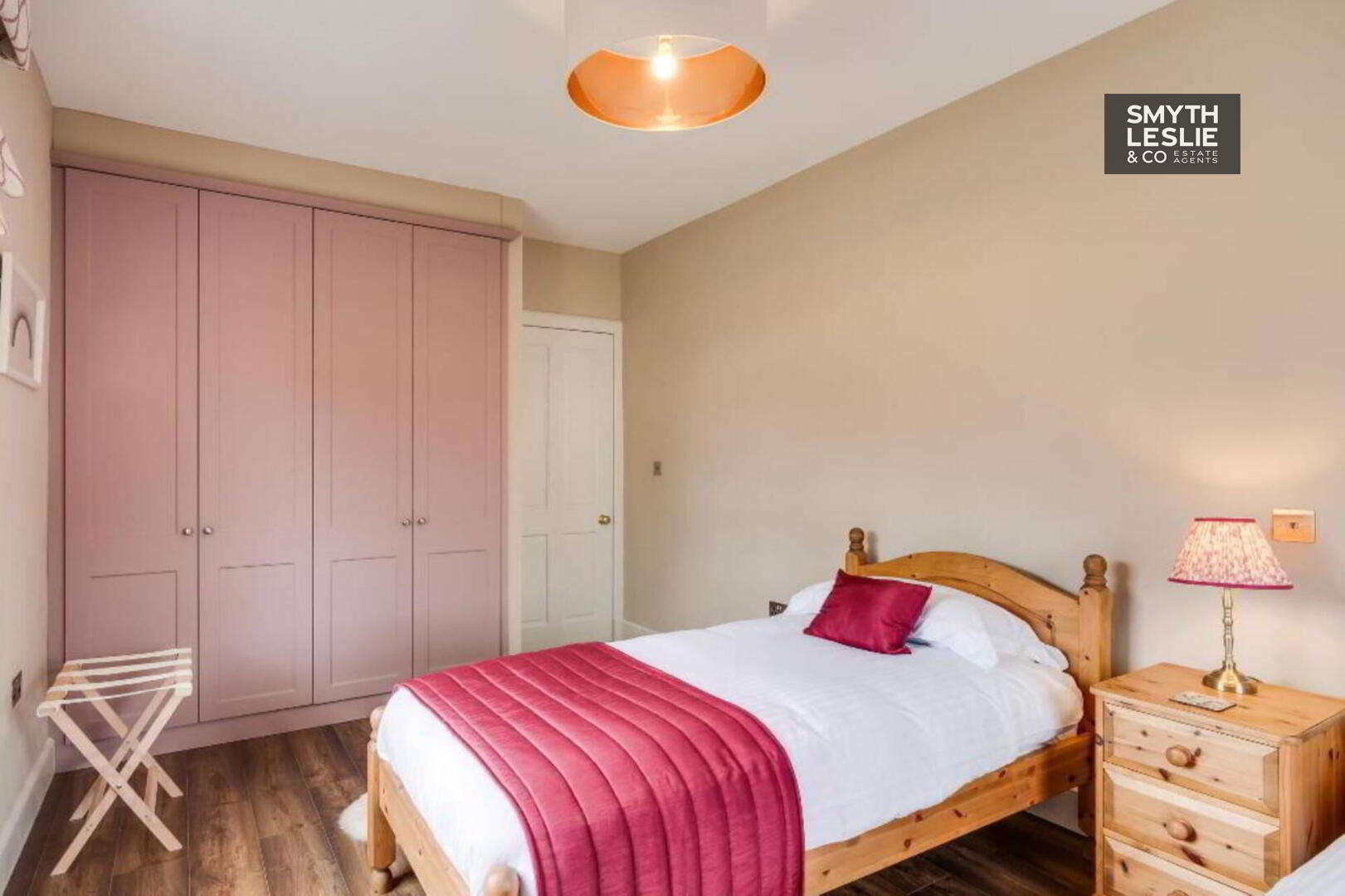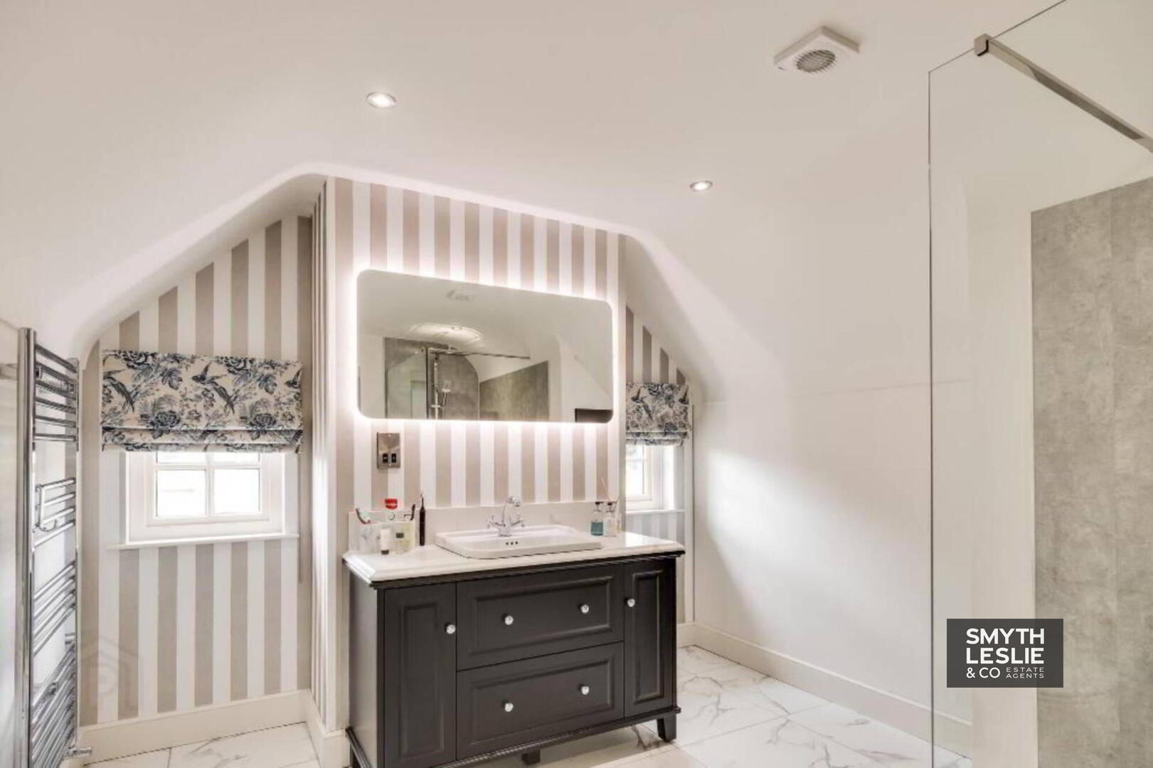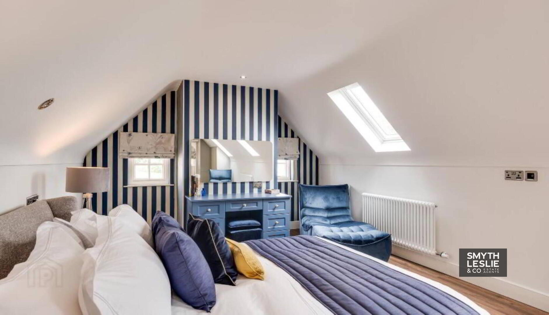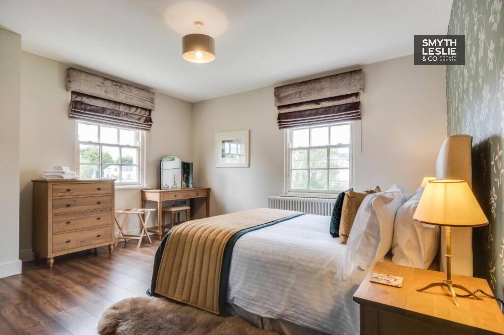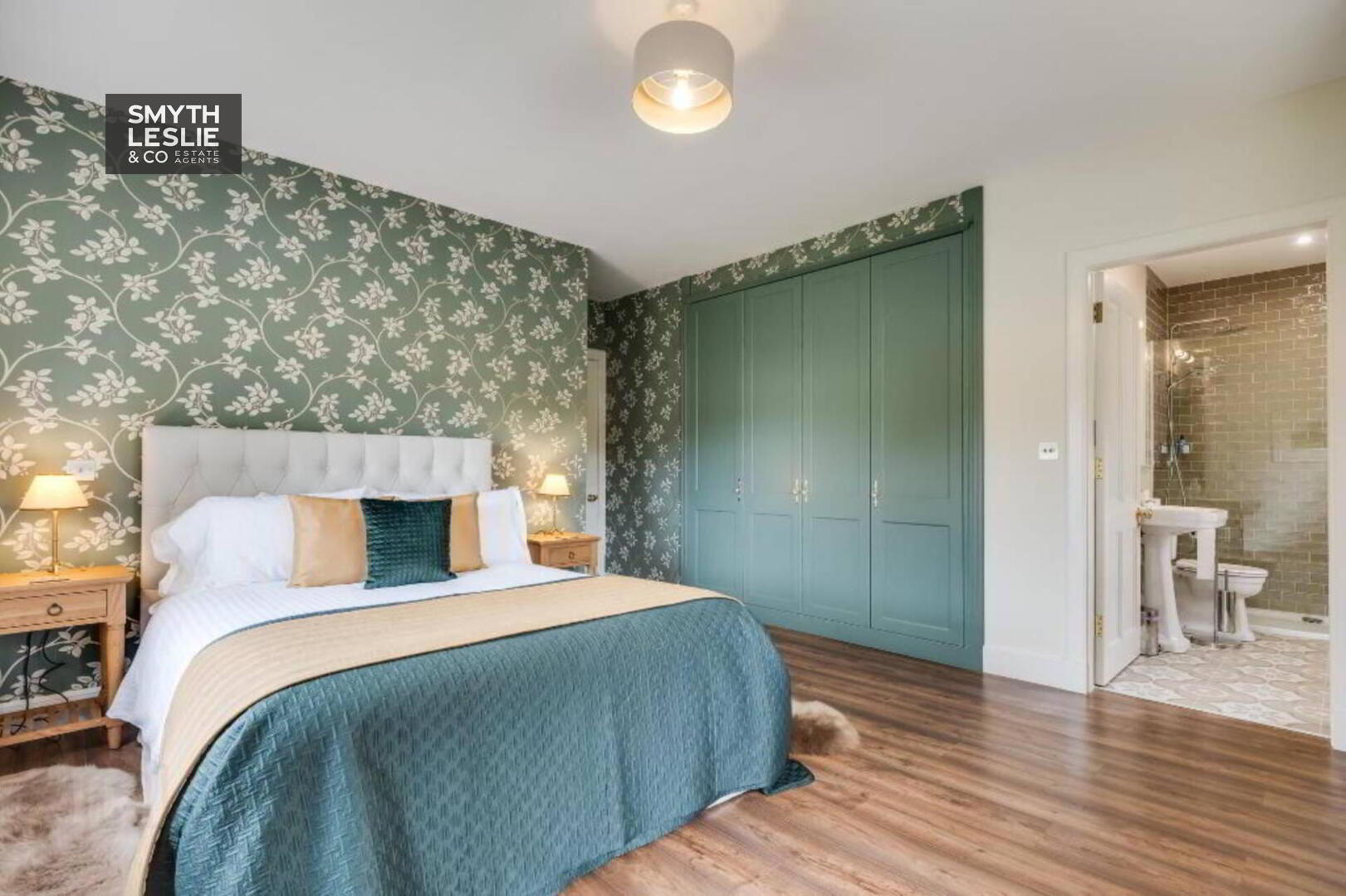 Fitted vanity unit, fitted wardrobes and storage, remote controlled electric roller blinds, laminate flooring, recessed lighting.
