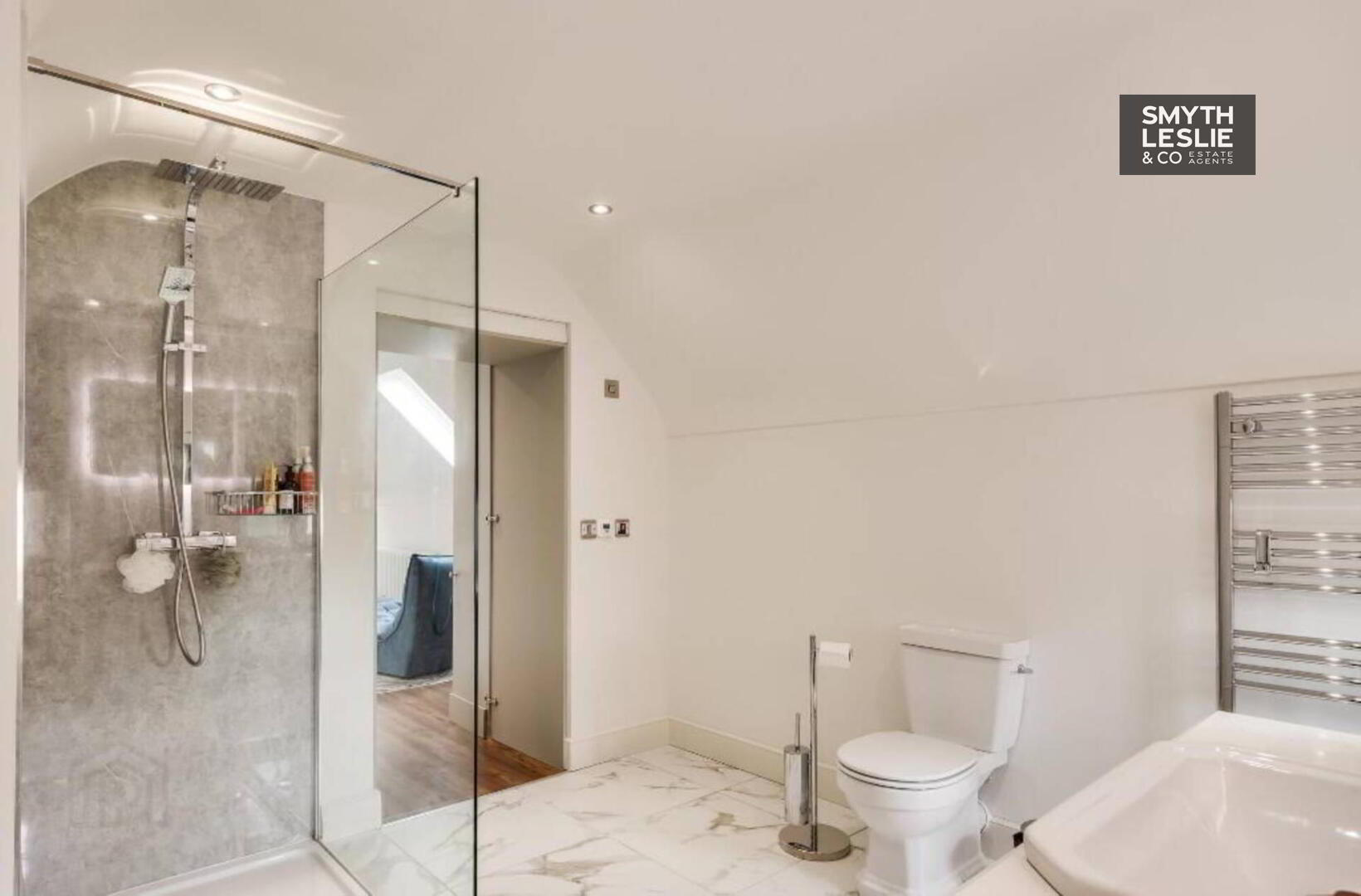 Wc, whb, walk in shower with glazed shower screen and tiled splashback, thermostatically controlled shower, heated towel rail, tiled floor.