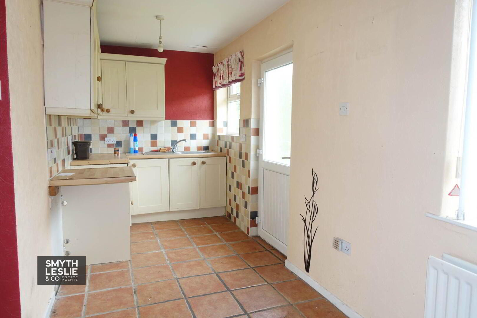 Fitted kitchen units, s.s.sink unit, half tiled walls, PVC exterior door with glazed inset, tiled floor.