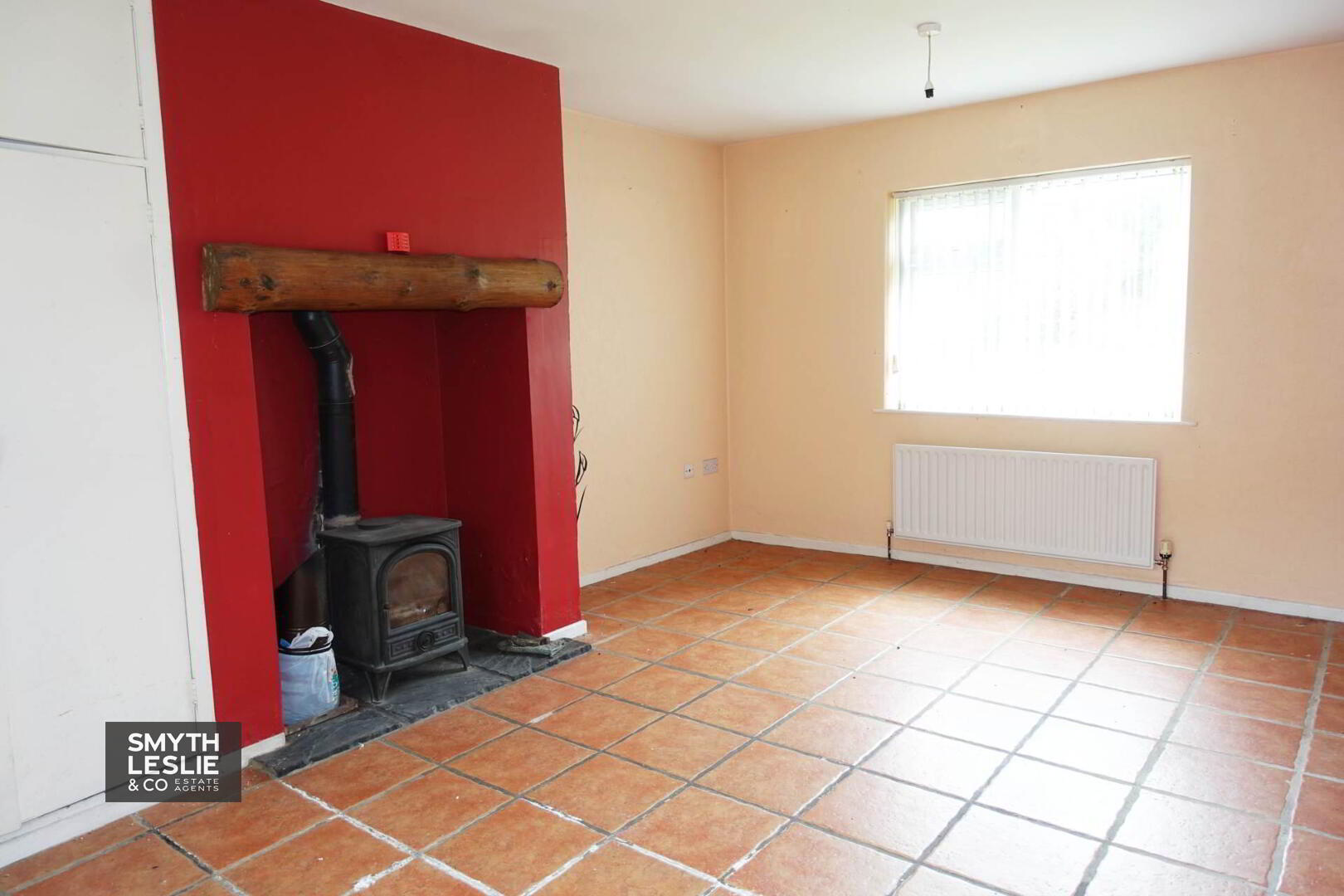 Pen hearth with multi fuel stove, log mantle, tiled hearth, tiled flooring, hotpress.