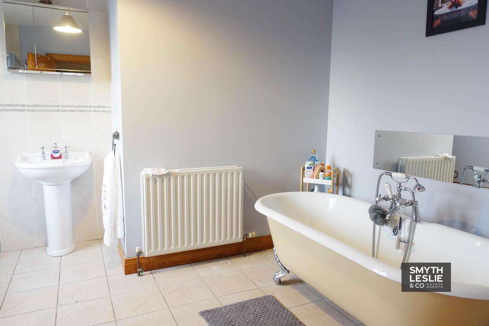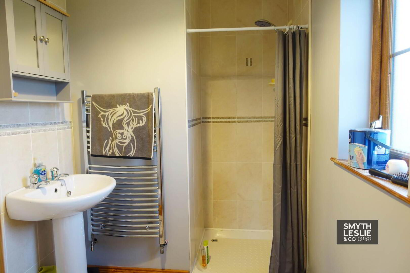 (Widest points) White suite, cast iron bath with telephone shower taps, step in shower cubicle with thermostatically controlled shower, tiled floor & splash back