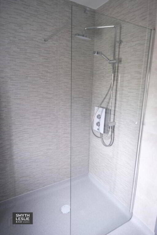 With electric shower, wet room style floor, fully tiled walls, spot lighting, vanity unit.