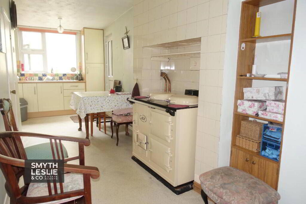 Fitted kitchen with a range of high and low level units, stainless steel sink unit, plumbed for washing machine, AGA oil fired cooker, tiled surround built in larder cupboard, PVC exterior door with glazed inset.