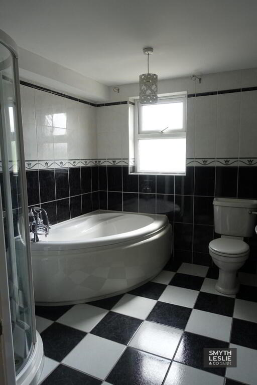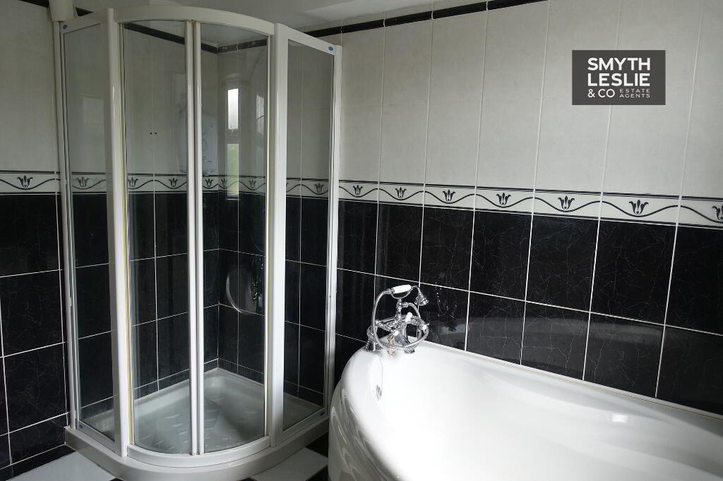 White suite, step in shower cubicle, plumbed for shower, fully tiled.
