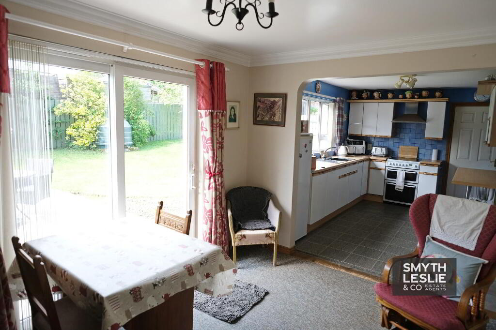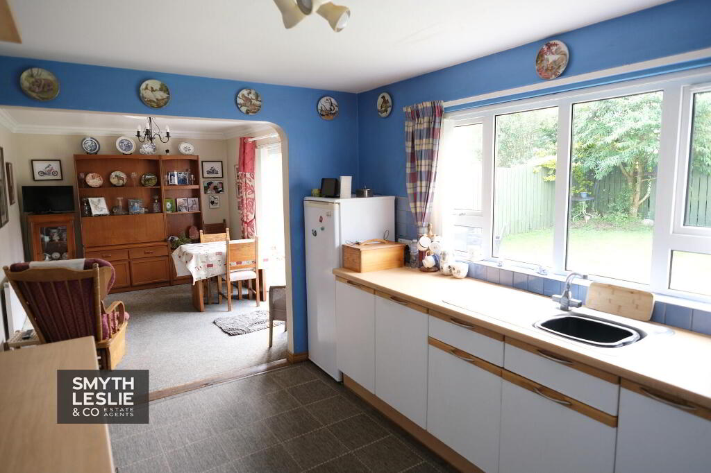 With full range of high & low level cupboards, breakfast bar, stainless steel sink unit, extractor fan hood, tiled splashback & floor, connecting archway to Dining Room.