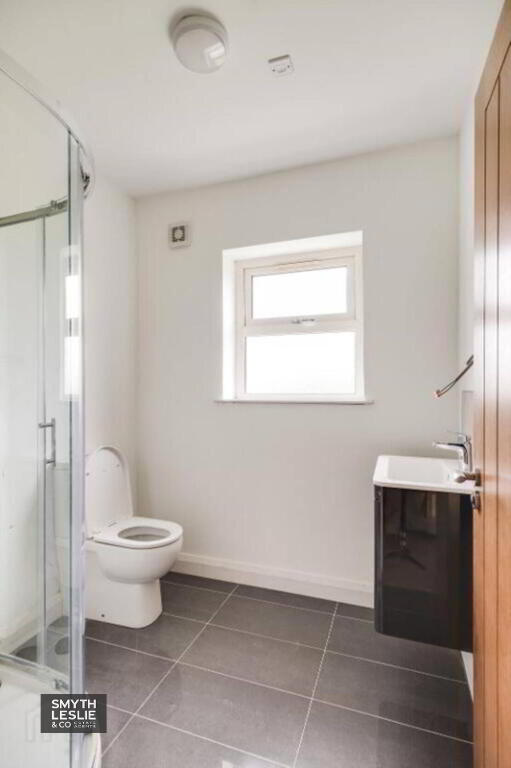White suite, step in shower cubicle with thermostatically controlled shower, tiled floor & splash back.