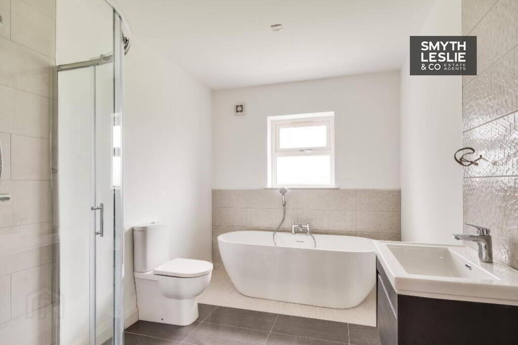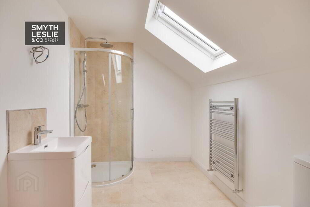 Contemporary white suite, centred bath, vanity unit, corner shower cubicle with thermostatically controlled shower, tiled floor & splash back, heated towel rail.