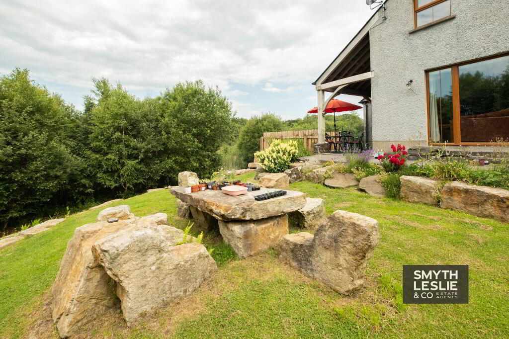 Set on approximately 7 acres of recreational land, the property boasts expansive grounds that includes mature woodland, creating a natural sanctuary around the home. Its gardens provide the perfect natural environment and so many features including a raised terrace with outdoor fire that affords an ideal vantage point overlooking its beautiful surroundings.