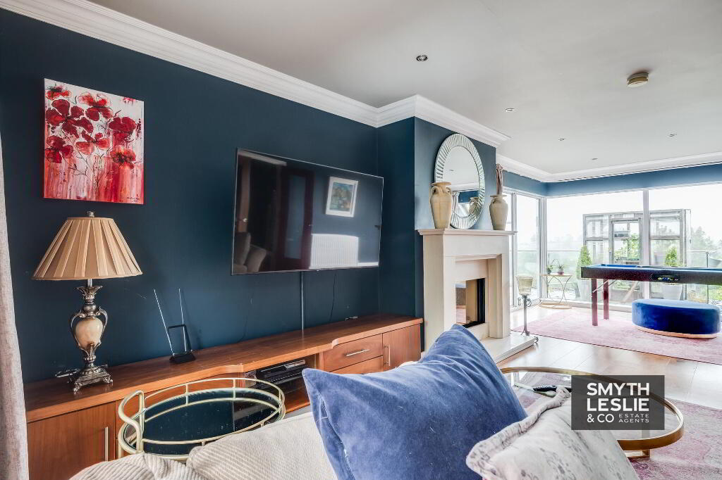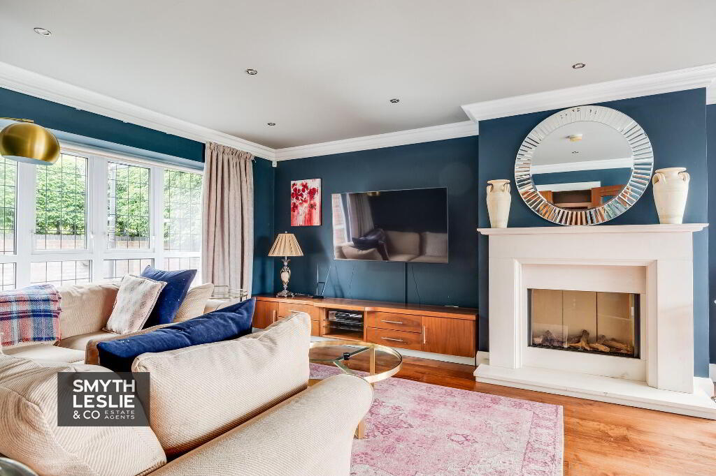 Marble fireplace surround with gas fire, hard wood floor, corner window with sliding patio door to terrace & views over Lough Erne, ceiling cornice, recessed lighting