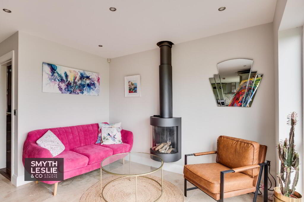 Solid fuel raised stove, double patio doors to terrace & views towards Lough Erne, recessed lighting, limestone tiled floor